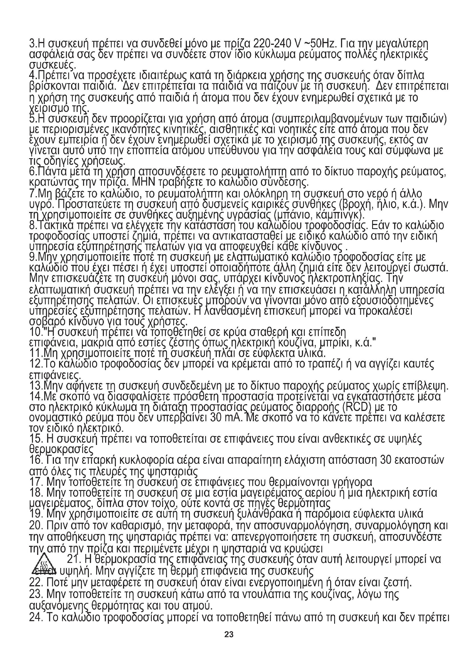 22. Ποτέ μην μεταφέρετε τη συσκευή όταν είναι ενεργοποιημένη ή όταν είναι ζεστή.