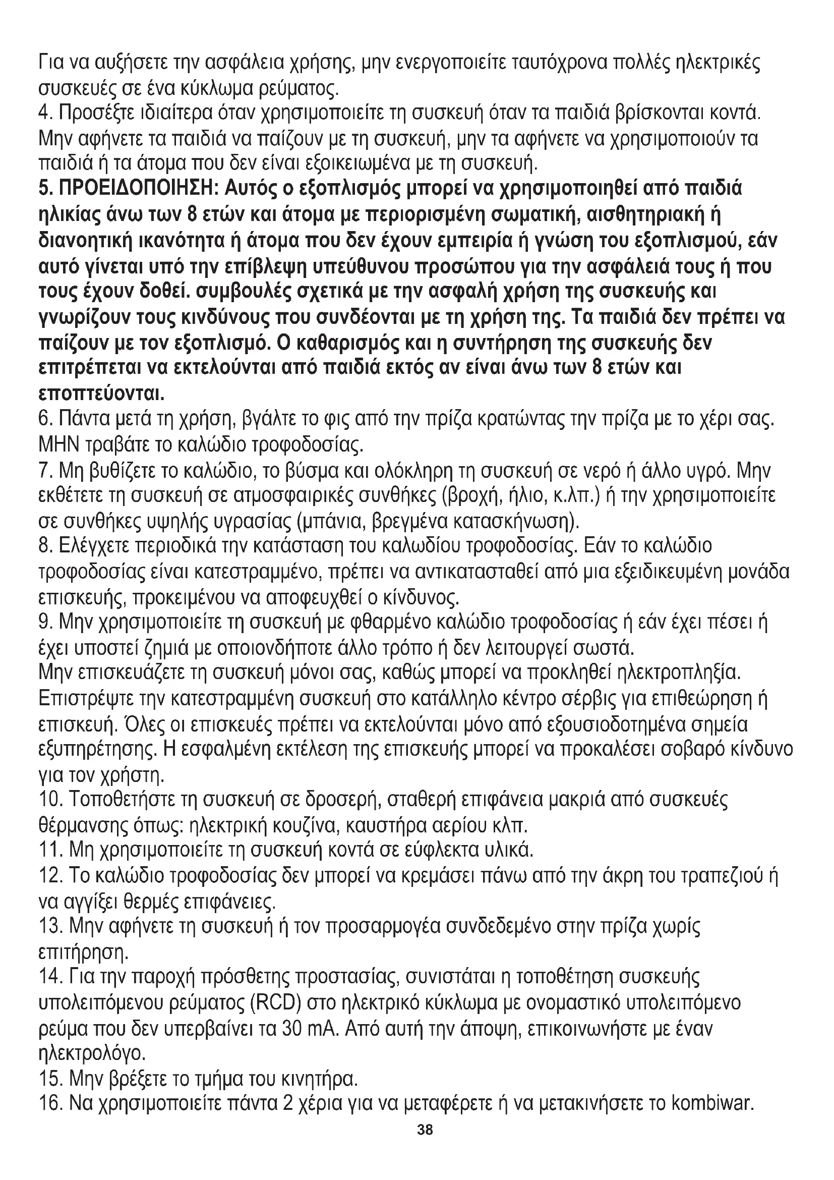 37Για να αυξήσετε την ασφάλεια χρήσης, μην ενεργοποιείτε ταυτόχρονα πολλές ηλεκτρικές συσκευές σε ένα κύκλωμα ρεύματος.
