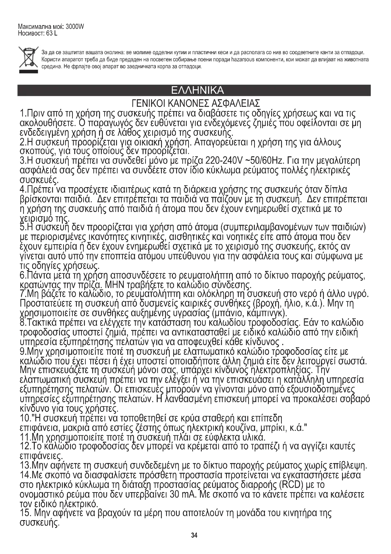 За да се заштитат вашата околина: ве молиме одделни кутии и пластични кеси и да располага со нив во соодветните канти за отпадоци. Користи апаратот треба да биде предаден на посветен собирање поени поради hazarsous компоненти, кои можат да влијаат на животната средина. Не фрлајте овој апарат во заедничката корпа за отпадоци. Максимална моќ: 3000W Носивост: 63 L 1.Πριν από τη χρήση της συσκευής πρέπει να διαβάσετε τις οδηγίες χρήσεως και να τις ακολουθήσετε. Ο παραγωγός δεν ευθύνεται για ενδεχόμενες ζημιές που οφείλονται σε μη ενδεδειγμένη χρήση ή σε λάθος χειρισμό της συσκευής. 3.Η συσκευή πρέπει να συνδεθεί μόνο με πρίζα 220-240V ~50/60Hz. Για την μεγαλύτερη ασφάλειά σας δεν πρέπει να συνδέετε στον ίδιο κύκλωμα ρεύματος πολλές ηλεκτρικές