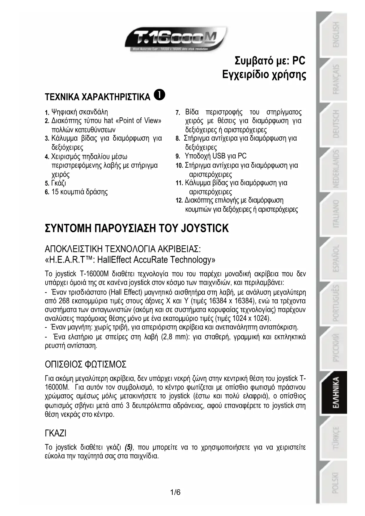 Συμβατό με: PC Εγχειρίδιο χρήσης ΤΕΧΝΙΚΑ ΧΑΡΑΚΤΗΡΙΣΤΙΚΑ ΣΥΝΤΟΜΗ ΠΑΡΟΥΣΙΑΣΗ ΤΟΥ JOYSTICK ΑΠΟΚΛΕΙΣΤΙΚΗ ΤΕΧΝΟΛΟΓΙΑ ΑΚΡΙΒΕΙΑΣ: «H.E.A.R.T™: HallEffect AccuRate Technology»