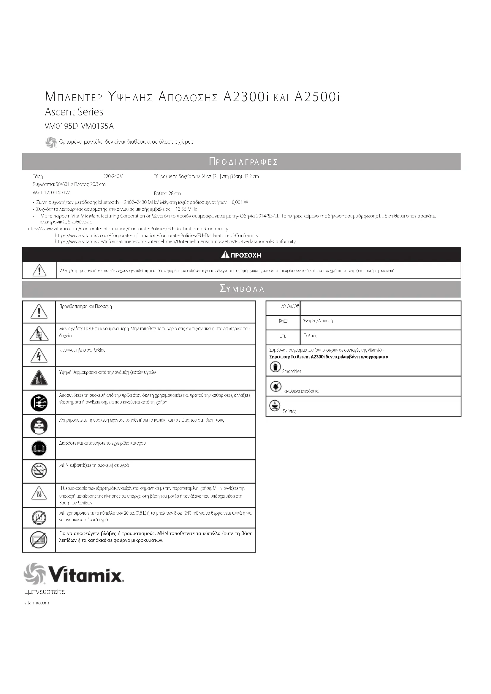 - Με το παρόν η Vita-Mix Manufacturing Corporation δηλώνει ότι το προϊόν συμμορφώνεται με την Οδηγία 2014/53/ΕΕ. Το πλήρες κείμενο της δήλωσης συμμόρφωσης ΕΕ διατίθεται στις παρακάτω ηλεκτρονικές διευθύνσεις: https://www.vitamix.com/Corporate-Information/Corporate-Policies/EU-Declaration-of-Conformity https://www.vitamix.co.uk/Corporate-Information/Corporate-Policies/EU-Declaration-of-Conformity https://www.vitamix.de/Informationen-zum-Unternehmen/Unternehmensgrundsaetze/EU-Declaration-of-Conformity I/O On/Off