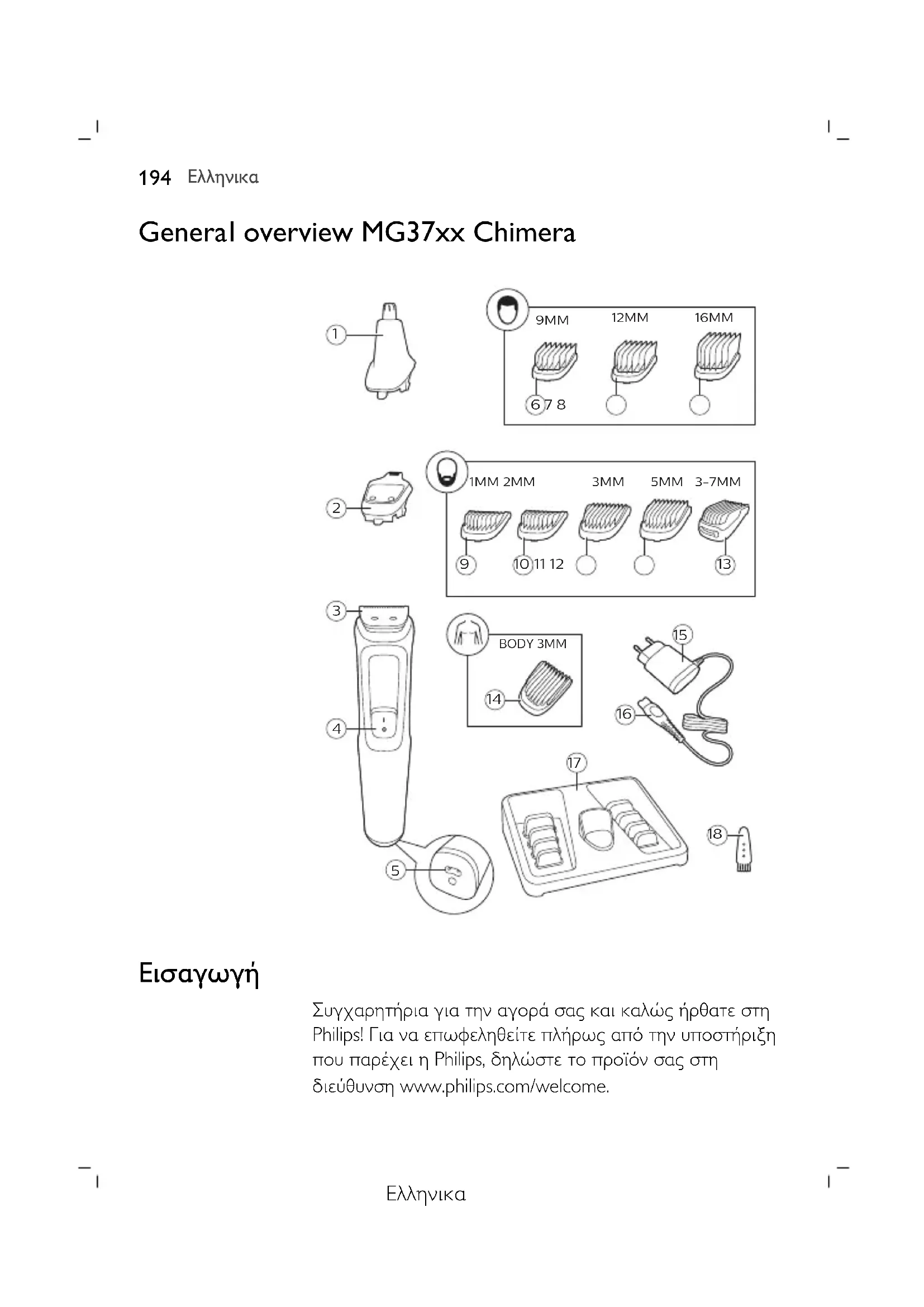 ΕλληνικαΓενική περιγραφή (Εικ.1) 1 Κόπτης τριχών μύτης (μόνο στους τύπους MG3710, MG3711, MG3712, MG3721, MG3720, MG3730, MG3731, MG3740, MG3747, MG3748, MG3757) 2 Κόπτης ακριβείας (μόνο στους τύπους MG3740, MG3757) 3 Κόπτης τριχών πλήρους μεγέθους 4 Διακόπτης ενεργοποίησης/απενεργοποίησης 5 Υποδοχή για μικρό βύσμα 6 Χτένα τριχών (9mm) (μόνο στους τύπους MG3720, MG3721, MG3730, MG3731, MG3740, MG3747, MG3748, MG3757) 7 Χτένα τριχών (12mm) (μόνο στους τύπους MG3730, MG3740, MG3747, MG3757, MG3731, MG3748) 8 Χτένα τριχών (16mm) (μόνο στους τύπους MG3730, MG3740, MG3747, MG3757, MG3731, MG3748) 9 Χτένα για πολύ κοντά γένια (1mm) (μόνο στους τύπους MG3710, MG3711, MG3712, MG3720, MG3721, MG3730, MG3731, MG3740, MG3747, MG3748, MG3757) 10 Χτένα για πολύ κοντά γένια (2mm) (μόνο στους τύπους MG3710, MG3711, MG3720, MG3721, MG3730, MG3731, MG3740, MG3747, MG3748, MG3757) 11 Χτένα για πολύ κοντά γένια 3mm (μόνο στους τύπους MG3710, MG3711, MG3712, MG3720, MG3721) 12 Χτένα για πολύ κοντά γένια 5mm (μόνο στους τύπους MG3710, MG3711, MG3712, MG3720, MG3721) 13 Ρυθμιζόμενη χτένα (3-7mm) (μόνο στους τύπους MG3730, MG3731, MG3740, MG3747, MG3748, MG3757) 14 Χτένα σώματος (3mm) (μόνο στους τύπους MG3747, MG3748) 15 Τροφοδοτικό 16 Μικρό βύσμα 17 Θήκη φύλαξης (μόνο στους τύπους MG3711, MG3712, MG3721, MG3731, MG3748) 18 Βουρτσάκι καθαρισμού