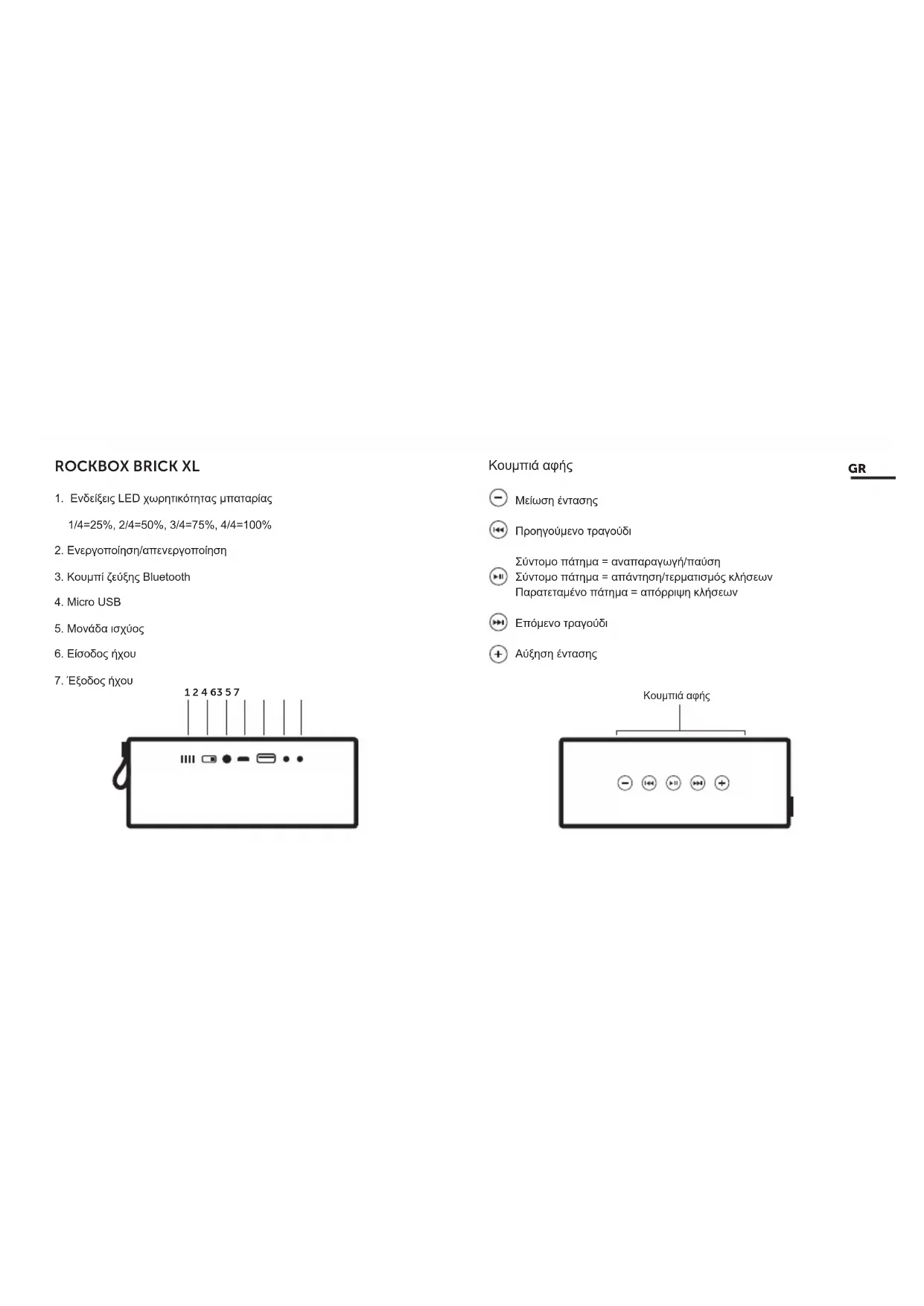 (διπλό κλικ).3. Όταν ακούσετε το ηχητικό σήμα (μπιπ) και από τα δύο ηχεία, έχουν συνδεθεί επιτυχώς μεταξύ τους.4. Τώρα ενεργοποιήστε τη σύνδεση Bluetooth στο τηλέφωνο, στο tablet ή στον φορητό υπολογιστή σας. 5. Πατήστε παρατεταμένα το κουμπί Bluetooth στο ηχείο (1) μέχρι να αναβοσβήσουν τα LED.6. Στο μενού Bluetooth, επιλέξτε ‘Rockbox Brick XL’. 7. Μόλις ακούσετε το ηχητικό σήμα (μπιπ), η συσκευή σας έχει συνδεθεί!Μπορείτε πλέον να απολαύσετε σούπερ-στερεοφωνικό ήχο.