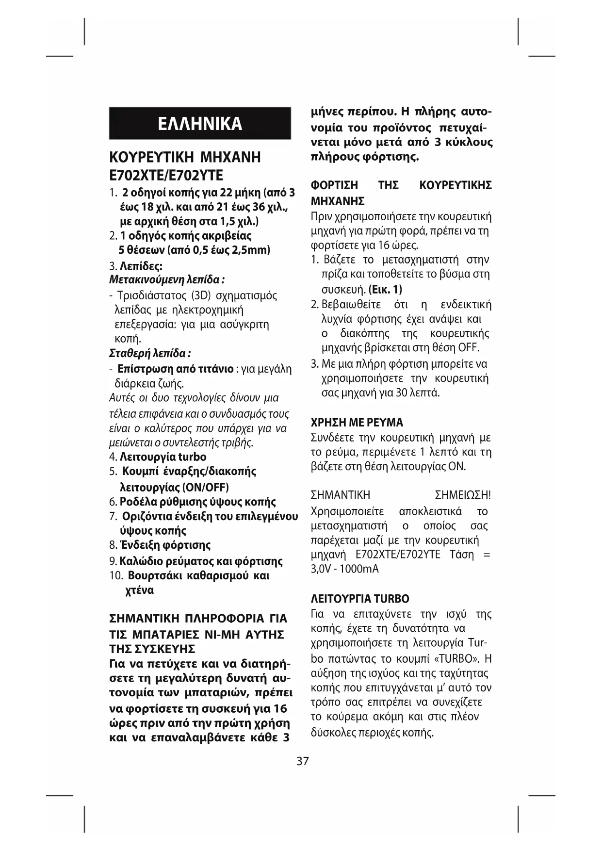 χρησιμοποιήσετε την κουρευτική σας μηχανή για 30 λεπτά. ΧΡΗΣΗ ΜΕ ΡΕΥΜΑ Συνδέετε την κουρευτική μηχανή με το ρεύμα, περιμένετε 1 λεπτό και τη βάζετε στη θέση λειτουργίας ON. ΣΗΜΑΝΤΙΚΗ ΣΗΜΕΙΩΣΗ! Χρησιμοποιείτε αποκλειστικά το μετασχηματιστή ο οποίος σας παρέχεται μαζί με την κουρευτική μηχανή E702XTE/E702YTE Τάση = 3,0V - 1000mA ΛΕΙΤΟΥΡΓΙΑ TURBO Για να επιταχύνετε την ισχύ της κοπής, έχετε τη δυνατότητα να χρησιμοποιήσετε τη λειτουργία Tur- bo πατώντας το κουμπί «TURBO». Η αύξηση της ισχύος και της ταχύτητας κοπής που επιτυγχάνεται μ’ αυτό τον τρόπο σας επιτρέπει να συνεχίζετε το κούρεμα ακόμη και στις πλέον δύσκολες περιοχές κοπής.38 ΧΡΗΣΗ ΤΩΝ ΟΔΗΓΩΝ ΚΟΠΗΣ Πολύ πρακτικοί, και σας εγγυώνται ένα ομοιόμορφο ύψος κοπής. ΣΗΜΑΝΤΙΚΗ ΣΗΜΕΙΩΣΗ: Να τοποθετείτε τον οδηγό κοπής πάντα ΠΡΙΝ να ανάψετε την κουρευτική μηχανή και πάντα να τη σβήνετε προκειμένου να αλλάξετε οδηγό