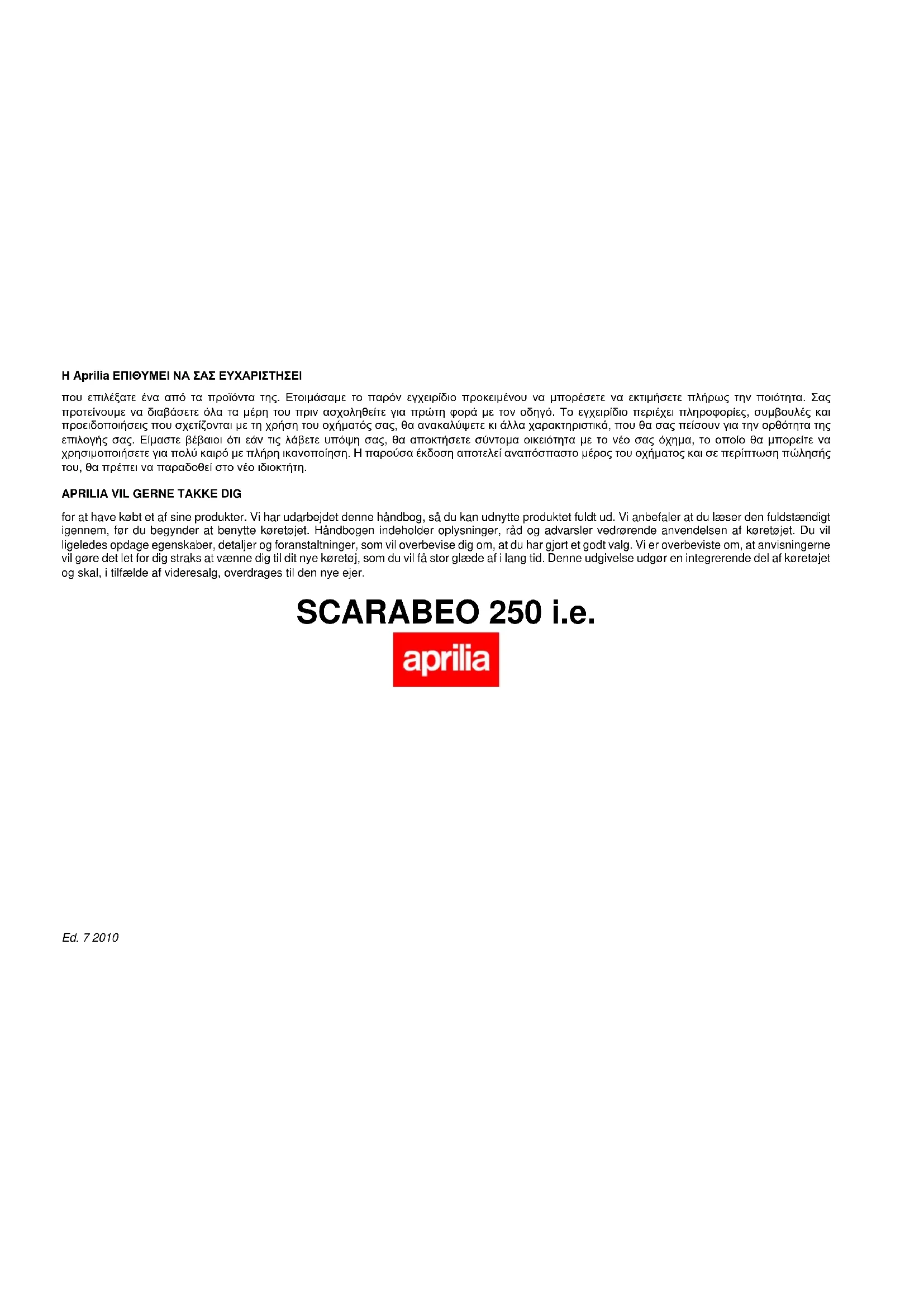 - for at have købt et af sine produkter. Vi har udarbejdet denne håndbog, så du kan udnytte produktet fuldt ud. Vi anbefaler at du læser den fuldstændigt igennem, før du begynder at benytte køretøjet. Håndbogen indeholder oplysninger, råd og advarsler vedrørende anvendelsen af køretøjet. Du vil ligeledes opdage egenskaber, detaljer og foranstaltninger, som vil overbevise dig om, at du har gjort et godt valg. Vi er overbeviste om, at anvisningerne vil gøre det let for dig straks at vænne dig til dit nye køretøj, som du vil få stor glæde af i lang tid. Denne udgivelse udgør en integrerende del af køretøjet og skal, i tilfælde af videresalg, overdrages til den nye ejer. SCARABEO 250 i.e. Ed. 7 2010Οι οδηγίες αυτού του εγχειριδίου ετοιμάστηκαν για να προσφέρουν πάνω απ'όλα έναν απλό και σαφή οδηγό χρήσης. Αναφέρονται επίσης ενέργειες απλής συντήρησης και περιοδικοί έλεγχοι που πρέπει να εκτελούνται στο όχημα από τους Αντιπροσώπους ή τα Εξουσιοδοτημένα συνεργεία Aprilia. Το βιβλιαράκι περιέχει επίσης οδηγίες για ορισμένες απλές επισκευές. Εργασίες που δεν περιγράφονται σ' αυτό το έντυπο, απαιτούν ειδικό εξοπλισμό ή/και ειδικές τεχνικές γνώσεις. Για την εκτέλεσή τους σας συνιστούμε να απευθύνεστε στους Αντιπροσώπους ή στα Εξουσιοδοτημένα συνεργεία Aprilia. Hovedformålet med anvisningerne i denne håndbog er at give en enkel og klar brugsvejledning; Heri findes ligeledes de mindre vedligeholdelsesarbejder og periodiske kontroleftersyn, som køretøjet bør undergå hos forhandleren eller et autoriseret Aprilia-serviceværksted. Der formidles derudover anvisninger om visse nemme reparationer. De opgaver, der ikke udtrykkeligt beskrives i disse anvisninger, kræver særligt udstyr og/eller særlig teknisk viden. og det anbefales derfor at rette henvendelse til en forhandler eller et autoriseret Aprilia-serviceværksted. 2Ασφαλεια προσωπων Η μερική ή ολική μη τήρηση αυτών των οδηγιών μπο- ρεί να επιφέρει σοβαρό κίνδυνο για τη σωματική ακε- ραιότητα των ατόμων. Personlig sikkerhed Hel eller delvis tilsidesættelse af disse forskrifter kan sætte personernes sikkerhed alvorligt på spil. Προστασια περιβαλλοντοσ Υποδεικνύει τη σωστή συμπεριφορά που πρέπει να τηρείται, προκειμένου η χρήση του οχήματος να μην είναι επιζήμια για το φυσικό περιβάλλον. Miljøhensyn Angiver den korrekte brug af køretøjet for at hindre skader for miljøet. Ασφαλεια οχηματος Η μερική ή ολική μη τήρηση αυτών των οδηγιών συν- επάγεται κίνδυνο σοβαρών ζημιών για το όχημα και σε ορισμένες περιπτώσεις τη λήξη της εγγύησης Køretøjets integritet Køretøjet kan beskadiges eller ødelægges og garan- tien kan i visse tilfælde frafalde, hvis disse regler ikke overholdes til punkt og prikke. Τα σύμβολα που αναφέρονται πιο πάνω είναι πολύ σημαντικά. Χρησιμοποιούνται πράγματι για να τονί- σουν μέρη του εγχειριδίου στα οποία είναι απαραίτητο να σταματήσετε για λίγο προσεκτικότερα. Όπως βλέ- πετε, κάθε σήμα αποτελείται από διαφορετικό γραφικό σύμβολο για μεγαλύτερη ευκολία στην ανεύρεση των διαφόρων τμημάτων. Πριν εκκινήσετε τον κινητήρα, διαβάστε προσεκτικά το παρόν εγχειρίδιο και ιδιαίτερα την παράγραφο "ΑΣΦΑΛΗΣ ΟΔΗΓΗΣΗ". Η ασφάλειά σας καθώς και η ασφάλεια των άλλων δεν εξαρτάται μόνο από την ετοιμότητα των αντανακλαστικών και την ικανότητά σας, αλλά και από τη γνώση του οχήματος, από την καλή κατάστασή του και από τη γνώση των βασικών κανόνων ΑΣΦΑΛΟΥΣ ΟΔΗΓΗΣΗΣ. Σας συμβουλεύουμε να εξοικειωθείτε με το όχημα έτσι ώστε να μπορείτε να κινείστε σε όλες τις συνθήκες οδήγησης με απόλυτο έλεγχο και ασφάλεια. ΣΗΜΑ- ΝΤΙΚΟ Αυτό το εγχειρίδιο πρέπει να θεωρείται ανα- πόσπαστο τμήμα του οχήματος και πρέπει πάντα να το συνοδεύει ακόμα και σε περίπτωση μεταπώλησης. Ovennævnte signaler er meget vigtige. De fremhæver de steder i vejledningen, som man skal være særlig opmærksom på. Hvert signal består af forskellige gra- fiske symboler, der gør det nemt og overskueligt at finde frem til de forskellige afsnit. Inden motoren star- tes, skal man læse denne håndbog omhyggeligt, og især afsnittet "SIKKER KØRSEL". Din og andres sik- kerhed afhænger ikke kun din reaktionsevne og år- vågenhed, men også af et godt kendskab til køretøjet, køretøjets tilstand og et kendskab til de grundlæg- gende regler for SIKKER KØRSEL. Det tilrådes der- for, at man gør sig bekendt med køret