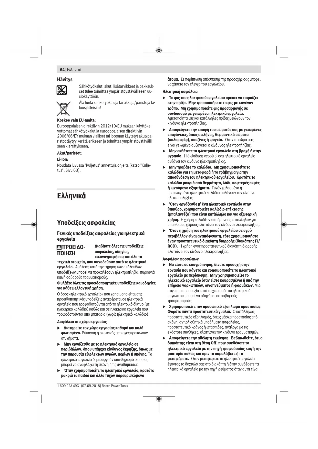 u Μην εργάζεσθε με το ηλεκτρικό εργαλείο σε περιβάλλον, όπου υπάρχει κίνδυνος έκρηξης, όπως με την παρουσία εύφλεκτων υγρών, αερίων ή σκόνης. Τα ηλεκτρικά εργαλεία δημιουργούν σπινθηρισμό ο οποίος μπορεί να αναφλέξει τη σκόνη ή τις αναθυμιάσεις. u Όταν χρησιμοποιείτε το ηλεκτρικό εργαλείο, κρατάτε μακριά τα παιδιά και άλλα τυχόν παρευρισκόμενα άτομα. Σε περίπτωση απόσπασης της προσοχής σας μπορεί να χάσετε τον έλεγχο του εργαλείου. Ηλεκτρική ασφάλεια u Το φις του ηλεκτρικού εργαλείου πρέπει να ταιριάζει στην πρίζα. Μην τροποποιήσετε το φις με κανέναν τρόπο. Μη χρησιμοποιείτε φις προσαρμογής σε συνδυασμό με γειωμένα ηλεκτρικά εργαλεία. Αμεταποίητα φις και κατάλληλες πρίζες μειώνουν τον κίνδυνο ηλεκτροπληξίας. u Αποφεύγετε την επαφή του σώματός σας με γειωμένες επιφάνειες, όπως σωλήνες, θερμαντικά σώματα (καλοριφέρ), κουζίνες ή ψυγεία. Όταν το σώμα σας είναι γειωμένο αυξάνεται ο κίνδυνος ηλεκτροπληξίας. u Μην εκθέτετε τα ηλεκτρικά εργαλεία στη βροχή ή στην υγρασία. Η διείσδυση νερού σ’ ένα ηλεκτρικό εργαλείο αυξάνει τον κίνδυνο ηλεκτροπληξίας. u Μην τραβάτε το καλώδιο. Μη χρησιμοποιείτε το καλώδιο για τη μεταφορά ή το τράβηγμα για την αποσύνδεση του ηλεκτρικού εργαλείου. Κρατάτε το καλώδιο μακριά από θερμότητα, λάδι, κοφτερές ακμές ή κινούμενα εξαρτήματα. Τυχόν χαλασμένα ή περιπλεγμένα ηλεκτρικά καλώδια αυξάνουν τον κίνδυνο ηλεκτροπληξίας. u Όταν εργάζεσθε μ’ ένα ηλεκτρικό εργαλείο στην ύπαιθρο, χρησιμοποιείτε καλώδιο επέκτασης (μπαλαντέζα) που είναι κατάλληλο και για εξωτερική χρήση. Ηχρήση καλωδίων επιμήκυνσης κατάλληλων για υπαίθριους χώρους ελαττώνει τον κίνδυνο ηλεκτροπληξίας. u Όταν η χρήση του ηλεκτρικού εργαλείου σε υγρό περιβάλλον είναι αναπόφευκτη, τότε χρησιμοποιήστε έναν προστατευτικό διακόπτη διαρροής (διακόπτηςFI/ RCD). Ηχρήση ενός προστατευτικού διακόπτη διαρροής ελαττώνει τον κίνδυνο ηλεκτροπληξίας. Ασφάλεια προσώπων u Να είστε σε επαγρύπνηση, δίνετε προσοχή στην εργασία που κάνετε και χρησιμοποιείτε το ηλεκτρικό εργαλείο με περίσκεψη. Μην χρησιμοποιείτε το ηλεκτρικό εργαλείο όταν είστε κουρασμένοι ή υπό την επήρεια ναρκωτικών, οινοπνεύματος ή φαρμάκων. Μια στιγμιαία απροσεξία κατά το χειρισμό του ηλεκτρικού εργαλείου μπορεί να οδηγήσει σε σοβαρούς τραυματισμούς. u Χρησιμοποιείτε τον προσωπικό εξοπλισμό προστασίας. Φοράτε πάντα προστατευτικά γυαλιά. Ο κατάλληλος προστατευτικός εξοπλισμός, όπως μάσκα προστασίας από σκόνη, αντιολισθητικά υποδήματα ασφαλείας, προστατευτικό κράνος ή ωτασπίδες, ανάλογα με τις εκάστοτε συνθήκες, ελαττώνει τον κίνδυνο τραυματισμών. u Αποφεύγετε την αθέλητη εκκίνηση. Βεβαιωθείτε, ότι ο διακόπτης είναι στη θέση Off, πριν συνδέσετε το ηλεκτρικό εργαλείο με την πηγή τροφοδοσίας και/ή την μπαταρία καθώς και πριν το παραλάβετε ή το μεταφέρετε. Όταν μεταφέρετε τα ηλεκτρικά εργαλεία έχοντας το δάχτυλό σας στο διακόπτη ή όταν συνδέσετε τα ηλεκτρικά εργαλεία με την πηγή ρεύματος όταν αυτά είναιακόμη στη θέση ΟΝ, τότε δημιουργείται κίνδυνος τραυματισμών. u Απομακρύνετε από το ηλεκτρικό εργαλείο τυχόν εξαρτήματα ρύθμισης ή κλειδιά πριν θέσετε το ηλεκτρικό εργαλείο σε λειτουργία. Ένα εργαλείο ή κλειδί συναρμολογημένο σ’ ένα περιστρεφόμενο τμήμα ενός ηλεκτρικού εργαλείου μπορεί να οδηγήσει σε τραυματισμούς. u Προσέχετε πως στέκεστε. Φροντίζετε για την ασφαλή στάση του σώματός σας 