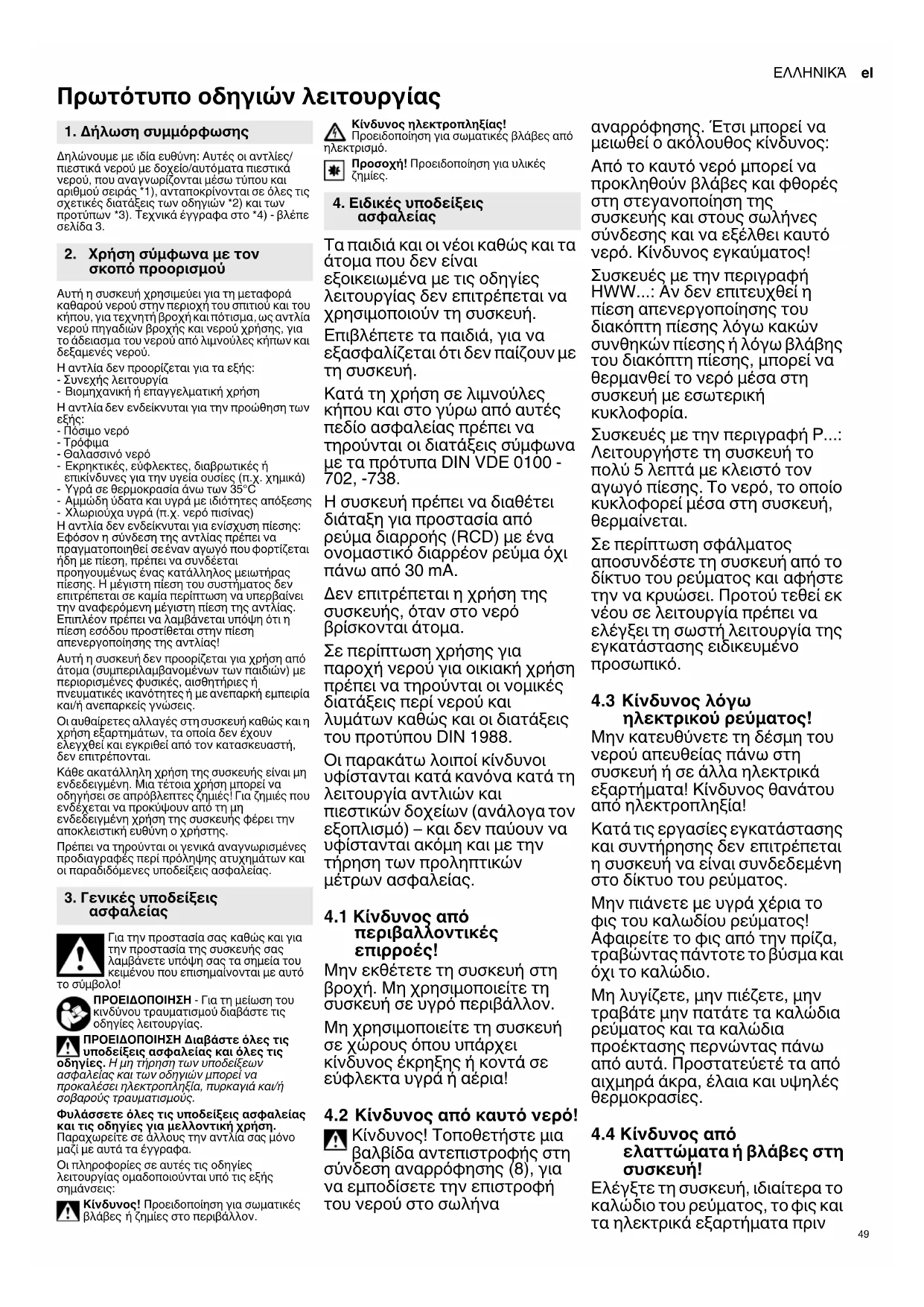 οι διατάξεις σύμφωνα με τα πρότυπα DIN VDE 0100 - 702, -738. Η συσκευή πρέπει να διαθέτει διάταξη για προστασία από ρεύμα διαρροής (RCD) με ένα ονομαστικό διαρρέον ρεύμα όχι πάνω από 30 mA. Δεν επιτρέπεται η χρήση της συσκευής, όταν στο νερό βρίσκονται άτομα. Σε περίπτωση χρήσης για παροχή νερού για οικιακή χρήση πρέπει να τηρούνται οι νομικές διατάξεις περί νερού και λυμάτων καθώς και οι διατάξεις του προτύπου DIN 1988. Οι παρακάτω λοιποί κίνδυνοι υφίστανται κατά κανόνα κατά τη λειτουργία αντλιών και πιεστικών δοχείων (ανάλογα τον εξοπλισμό) – και δεν παύουν να υφίστανται ακόμη και με την τήρηση των προληπτικών μέτρων ασφαλείας.
