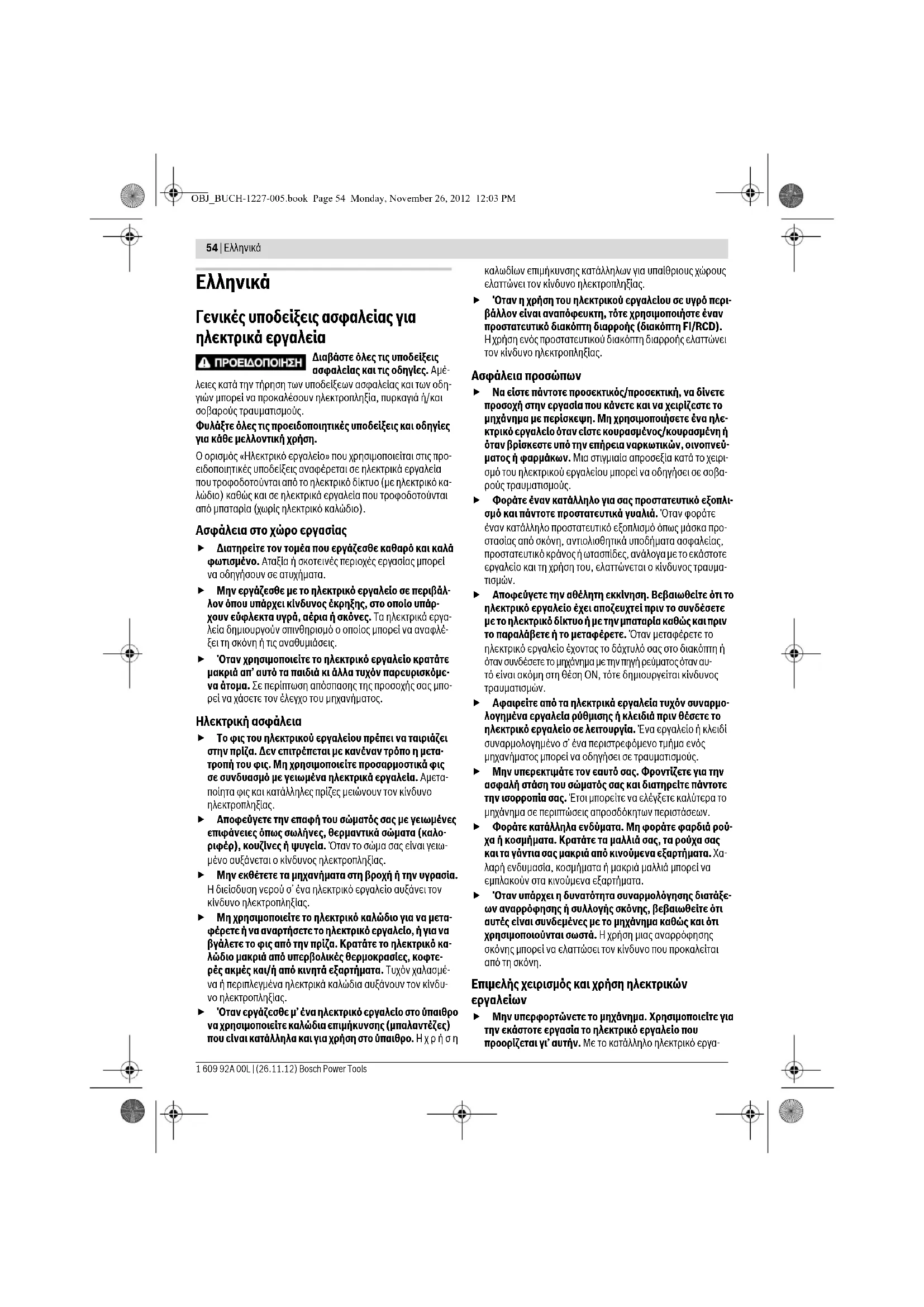 Μην υπερφορτώνετε το μηχάνημα. Χρησιμοποιείτε για την εκάστοτε εργασία το ηλεκτρικό εργαλείο που προορίζεται γι’ αυτήν. Με το κατάλληλο ηλεκτρικό εργα- OBJ_BUCH-1227-005.book Page 54 Monday, November 26, 2012 12:03 PMΕλληνικά | 55 Bosch Power Tools 1 609 92A 00L | (26.11.12) λείο εργάζεστε καλύτερα και ασφαλέστερα στην αναφερό- μενη περιοχή ισχύος. Μη χρησιμοποιήσετε ποτέ ένα μηχάνημα που έχει χαλα- σμένο διακόπτη. Ένα ηλεκτρικό εργαλείο που δεν μπορείτε πλέον να το θέσετε σε λειτουργία και/ή εκτός λειτουργίας εί- ναι επικίνδυνο και πρέπει να επισκευαστεί. Βγάλτε το φις από την πρίζα και/ή αφαιρέστε την μπατα- ρία πριν διεξάγετε στο μηχάνημα μια οποιαδήποτε εργα- σία ρύθμισης, πριν αλλάξετε ένα εξάρτημα ή όταν πρό- κειται να διαφυλάξετε/να αποθηκεύσετε το μηχάνημα. Αυτά τα προληπτικά μέτρα ασφαλείας μειώνουν τον κίνδυνο από τυχόν αθέλητη εκκίνηση του ηλεκτρικού εργαλείου. Διαφυλάγετε τα ηλεκτρικά εργαλεία που δε χρησιμοποι- είτε μακριά από παιδιά. Μην επιτρέψετε τη χρήση του μηχανήματος σε άτομα που δεν είναι εξοικειωμένα μ’ αυτό ή δεν έχουν διαβάσει τις παρούσες οδηγίες. Τα ηλε- κτρικά εργαλεία είναι επικίνδυνα όταν χρησιμοποιούνται από άπειρα πρόσωπα. Να περιποιείστε προσεκτικά το ηλεκτρικό εργαλείο. Ελέγχετε, αν τα κινούμενα εξαρτήματα λειτουργούν άψογα, χωρίς να μπλοκάρουν, ή μήπως έχουν σπάσει ή φθαρεί τυχόν εξαρτήματα τα οποία επηρεάζουν τον τρό- πο λειτουργίας του ηλεκτρικού εργαλείου. Δώστε αυτά τα χαλασμένα εξαρτήματα για επισκευή πριν τα ξανα- χρησιμοποιήσετε. Η κακή συντήρηση των ηλεκτρικών ερ- γαλείων αποτελεί αιτία πολλών ατυχημάτων. Διατηρείτε τα εργαλεία κοπής κοφτερά και καθαρά. Προσεκτικά συντηρημένα κοπτικά εργαλεία σφηνώνουν δυσκολότερα και οδηγούνται ευκολότερα. Χρησιμοποιείτε τα ηλεκτρικά εργαλεία, εξαρτήματα, πα- ρελκόμενα εργαλεία κτλ. σύμφωνα με τις παρούσες οδηγίες. Λαμβάνετε επίσης υπόψη σας τις εκάστοτε συν- θήκες και την υπό εκτέλεση εργασία. Η χρησιμοποίηση των ηλεκτρικών εργαλείων για εργασίες που δεν προβλέπο- νται γι’ αυτά μπορεί να δημιουργήσει επικίνδυνες καταστά-