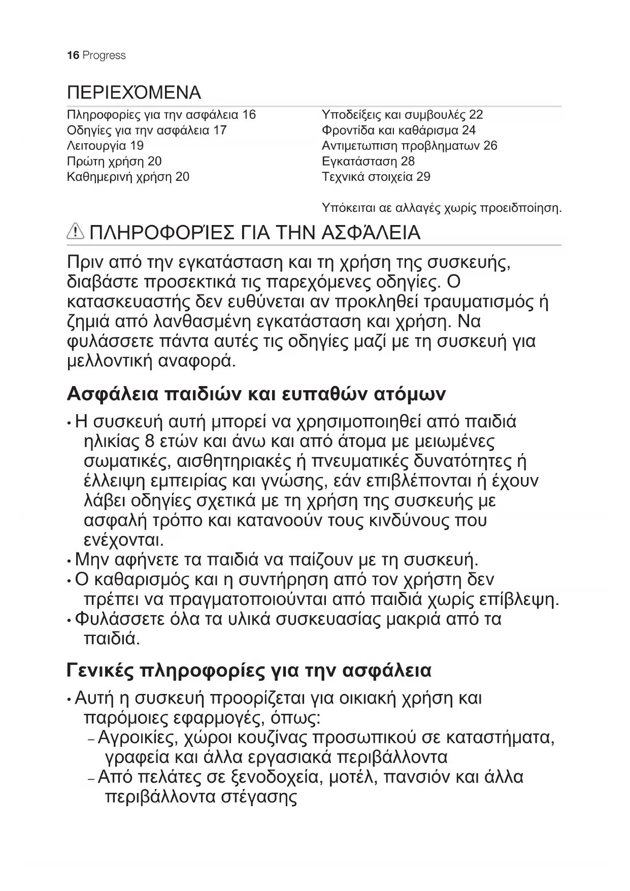 Caractéristiques techniques Hauteur mm 1441 Largeur mm 540 Profondeur mm 549 Autonomie de fonctionnement Heures 20 Tension Volts 230 - 240 Fréquence Hz 50 Les caractéristiques techniques figurent sur la plaque signalétique située sur le côté intérieur ou extérieur de l'appareil et sur l'étiquette énergétique. EN MATIÈRE DE PROTECTION DE L'ENVIRONNEMENT Recyclez les matériaux portant le symbole . Déposez les emballages dans les conteneurs prévus à cet effet. Contribuez à la protection de l'environnement et à votre sécurité, recyclez vos produits électriques et électroniques. Ne jetez pas les appareils portant le symbole avec les ordures ménagères. Emmenez un tel produit dans votre centre local de recyclage ou contactez vos services municipaux. Progress 15ΠΕΡΙΕΧΌΜΕΝΑ Πληροφορίες για την ασφάλεια 16 Οδηγίες για την ασφάλεια 17 Λειτουργία 19 Πρώτη χρήση 20 Καθημερινή χρήση 20 Υποδείξεις και συμβουλές 22 Φροντίδα και καθάρισμα 24 Αντιμετωπιση προβληματων 26 Εγκατάσταση 28 Τεχνικά στοιχεία 29 Υπόκειται αε αλλαγές χωρίς προειδποίηση. ΠΛΗΡΟΦΟΡΊΕΣ ΓΙΑ ΤΗΝ ΑΣΦΆΛΕΙΑ Πριν από την εγκατάσταση και τη χρήση της συσκευής, διαβάστε προσεκτικά τις παρεχόμενες οδηγίες. Ο κατασκευαστής δεν ευθύνεται αν προκληθεί τραυματισμός ή ζημιά από λανθασμένη εγκατάσταση και χρήση. Να φυλάσσετε πάντα αυτές τις οδηγίες μαζί με τη συσκευή για μελλοντική αναφορά. Ασφάλεια παιδιών και ευπαθών ατόμων