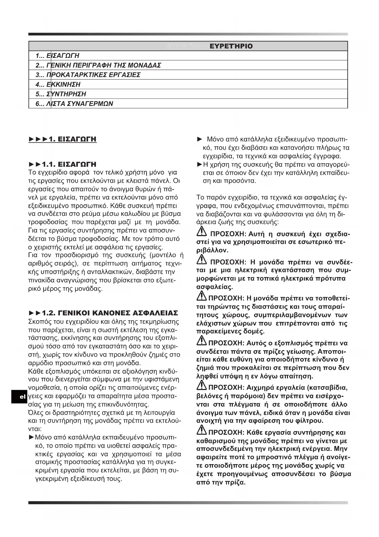 ΕΥΡΕΤΉΡΙΟΕΥΡΕΤΉΡΙΟ 1... ΕΙΣΑΓΩΓΗ 2... ΓΕΝΙΚΗ ΠΕΡΙΓΡΑΦΗ ΤΗΣ ΜΟΝΑΔΑΣ 3... ΠΡΟΚΑΤΑΡΚΤΙΚΕΣ ΕΡΓΑΣΙΕΣ 4... ΕΚΚΙΝΗΣΗ 5... ΣΥΝΤΗΡΗΣΗ 6... ΛΙΣΤΑ ΣΥΝΑΓΕΡΜΩΝ ►►►1. ΕΙΣΑΓΩΓΗ ►►1.1. ΕΙΣΑΓΩΓΗ Το εγχειρίδιο αφορά τον τελικό χρήστη μόνο για τις εργασίες που εκτελούνται με κλειστά πάνελ. Οι εργασίες που απαιτούν το άνοιγμα θυρών ή πά- νελ με εργαλεία, πρέπει να εκτελούνται μόνο από εξειδικευμένο προσωπικό. Κάθε συσκευή πρέπει να συνδέεται στο ρεύμα μέσω καλωδίου με βύσμα τροφοδοσίας που παρέχεται μαζί με τη μονάδα. Για τις εργασίες συντήρησης πρέπει να αποσυν- δέεται το βύσμα τροφοδοσίας. Με τον τρόπο αυτό ο χειριστής εκτελεί με ασφάλεια τις εργασίες. Για τον προσδιορισμό της συσκευής (μοντέλο ή αριθμός σειράς), σε περίπτωση αιτήματος τεχνι- κής υποστήριξης ή ανταλλακτικών, διαβάστε την πινακίδα αναγνώρισης που βρίσκεται στο εξωτε- ρικό μέρος της μονάδας. ►►1.2. ΓΕΝΙΚΟΙ ΚΑΝΟΝΕΣ ΑΣΦΑΛΕΙΑΣ Σκοπός του εγχειριδίου και όλης της τεκμηρίωσης που παρέχεται, είναι η σωστή εκτέλεση της εγκα- τάστασης, εκκίνησης και συντήρησης του εξοπλι- σμού τόσο από τον εγκαταστάτη όσο και το χειρι- στή, χωρίς τον κίνδυνο να προκληθούν ζημιές στο αρμόδιο προσωπικό και στη μονάδα. Κάθε εξοπλισμός υπόκειται σε αξιολόγηση κινδύ- νου που διενεργείται σύμφωνα με την υφιστάμενη νομοθεσία, η οποία ορίζει τις απαιτούμενες ενέρ- γειες και εφαρμόζει τα απαραίτητα μέσα προστα- σίας για τη μείωση της επικινδυνότητας. Όλες οι δραστηριότητες σχετικά με τη λειτουργία και τη συντήρηση της μονάδας πρέπει να εκτελού-