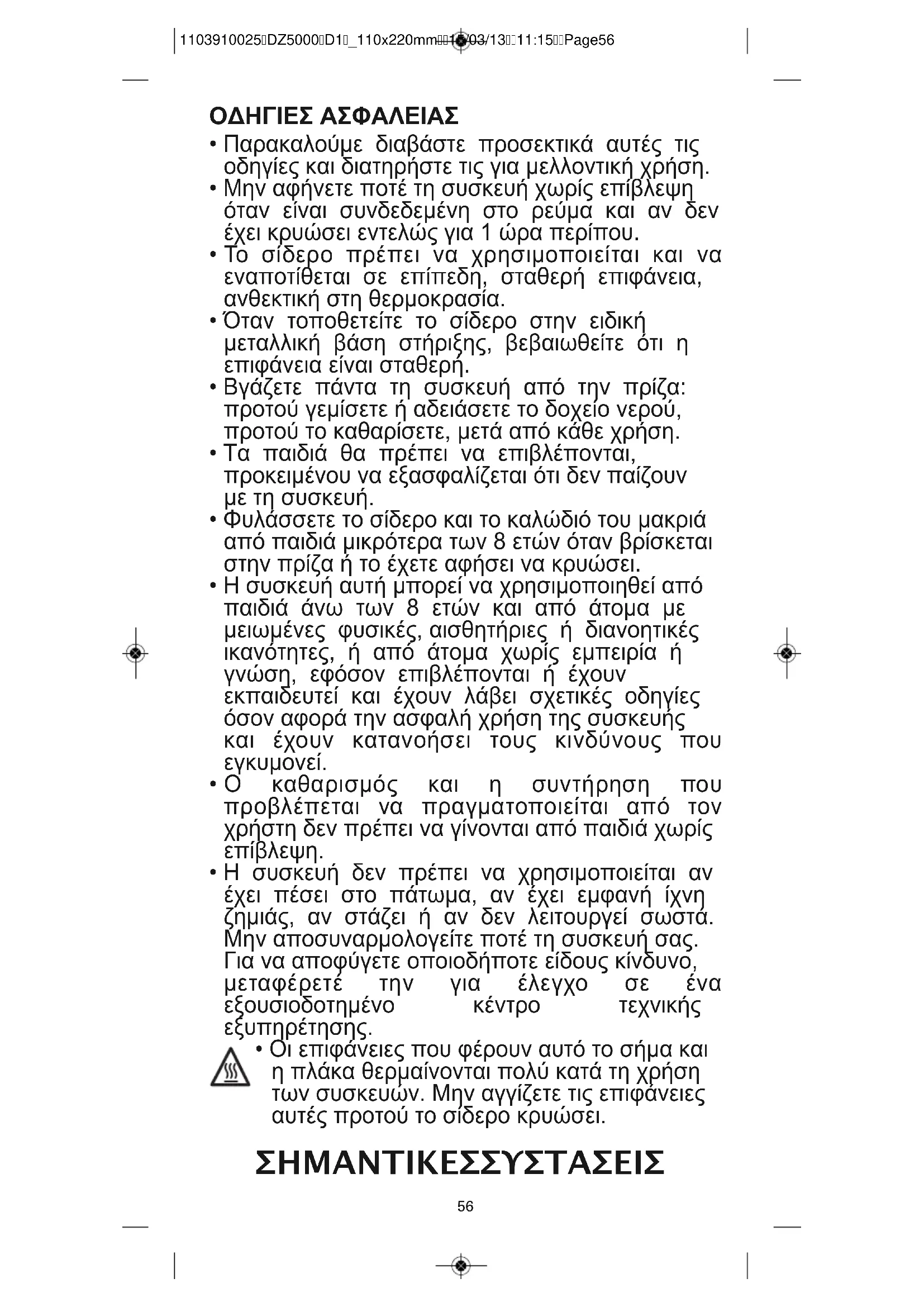 - Οι επιφάνειες που φέρουν αυτό το σήμα και η πλάκα θερμαίνονται πολύ κατά τη χρήση των συσκευών. Μην αγγίζετε τις επιφάνειες αυτές προτού το σίδερο κρυώσει. ΣΗΜΑΝΤΙΚΕΣ ΣΥΣΤΑΣΕΙΣ 1103910025DZ5000D1_110x220mm15/03/1311:15Page5657