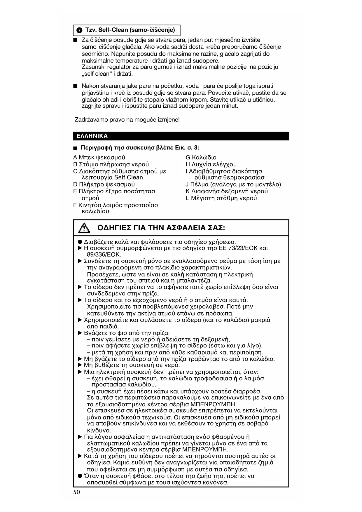 Περιγραφή τησ συσκευήσ βλέπε Εικ. σ. 3: Ο∆ΗΓΙΕΣ ΓΙΑ ΤΗΝ ΑΣΦΑΛΕΙΑ ΣΑΣ: P ∆ιαβάζετε καλά και φυλάσσετε τισ οδηγίεσ χρήσεωσ. E Η συσκευή συµµορφώνεται µε τισ οδηγίεσ τησ ΕΕ 73/23/ΕΟΚ και 89/336/ΕΟΚ. E Συνδέετε τη συσκευή µνο σε εναλλασσµενο ρεύµα µε τάση ίση µε την αναγραφµενη στο πλακίδιο χαρακτηριστικών. Προσέχετε, ώστε να είναι σε καλή κατάσταση η ηλεκτρική εγκατάσταση του σπιτιού και η µπαλαντέζα. E Το σίδερο δεν πρέπει να το αφήνετε ποτέ χωρίσ επίβλεψη σο είναι συνδεδεµένο στην πρίζα. E Το σίδερο και το εξερχµενο νερ ή ο ατµσ είναι καυτά. Χρησιµοποιείτε τισ προβλεπµενεσ χειρολαβέσ. Ποτέ µην κατευθύνετε την ακτίνα ατµού επάνω σε πρσωπα. E Χρησιµοποιείτε και φυλάσσετε το σίδερο (και το καλώδιο) µακριά