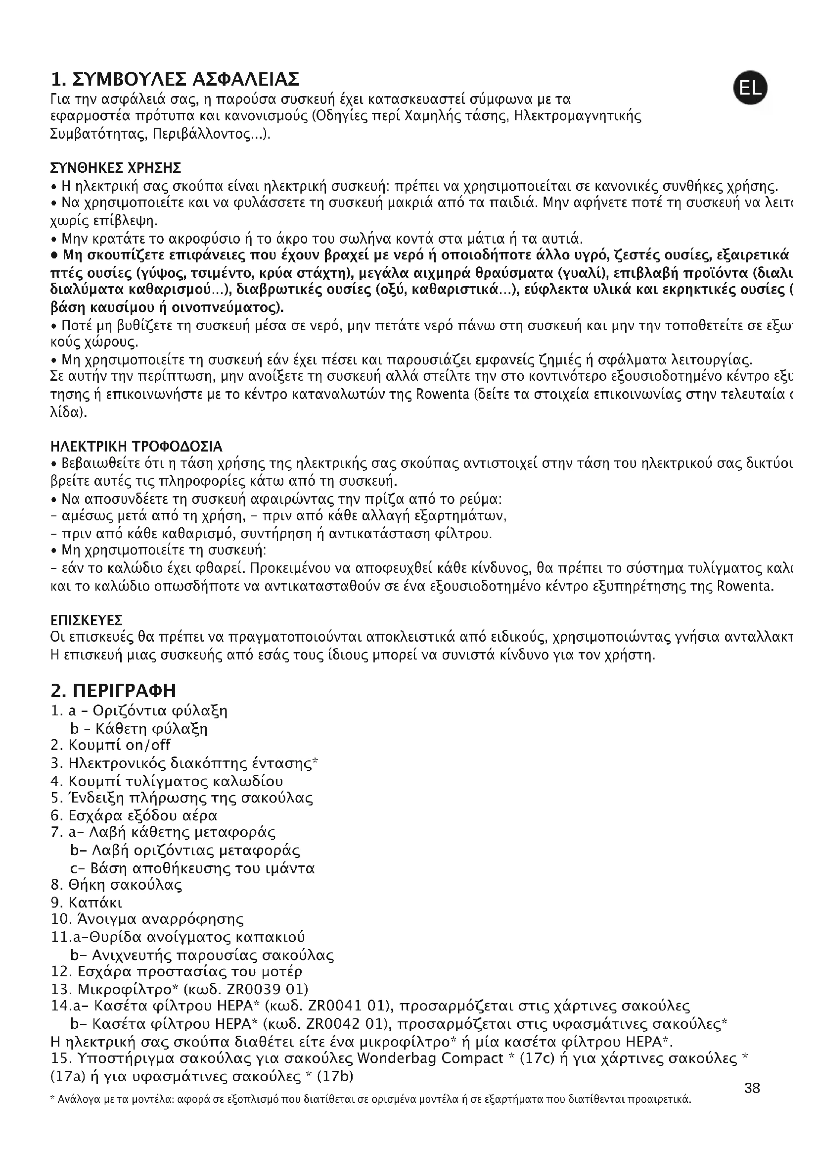 14.a- Κασέτα φίλτρου HEPA* (κωδ. ZR0041 01), προσαρμόζεται στις χάρτινες σακούλες b- Κασέτα φίλτρου HEPA* (κωδ. ZR0042 01), προσαρμόζεται στις υφασμάτινες σακούλες* Η ηλεκτρική σας σκούπα διαθέτει είτε ένα μικροφίλτρο* ή μία κασέτα φίλτρου HEPA*.
