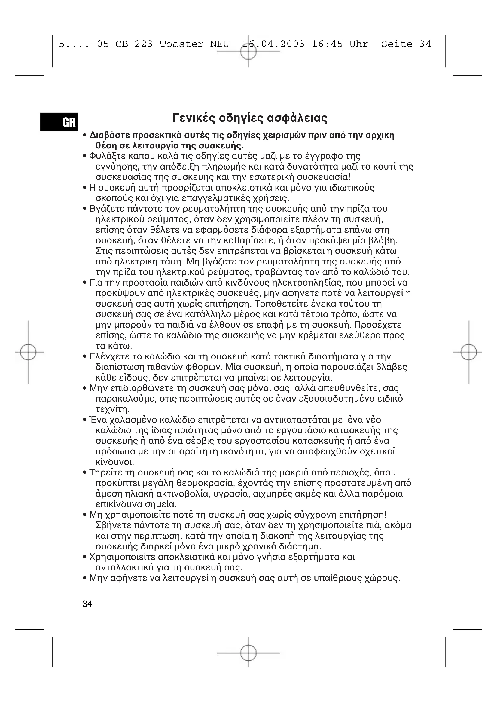 - Μην αφήνετε να λειτουργεί η συσκευή σας αυτή σε υπαίθριους χώρους. 5....-05-CB 223 Toaster NEU 16.04.2003 16:45 Uhr Seite 3435