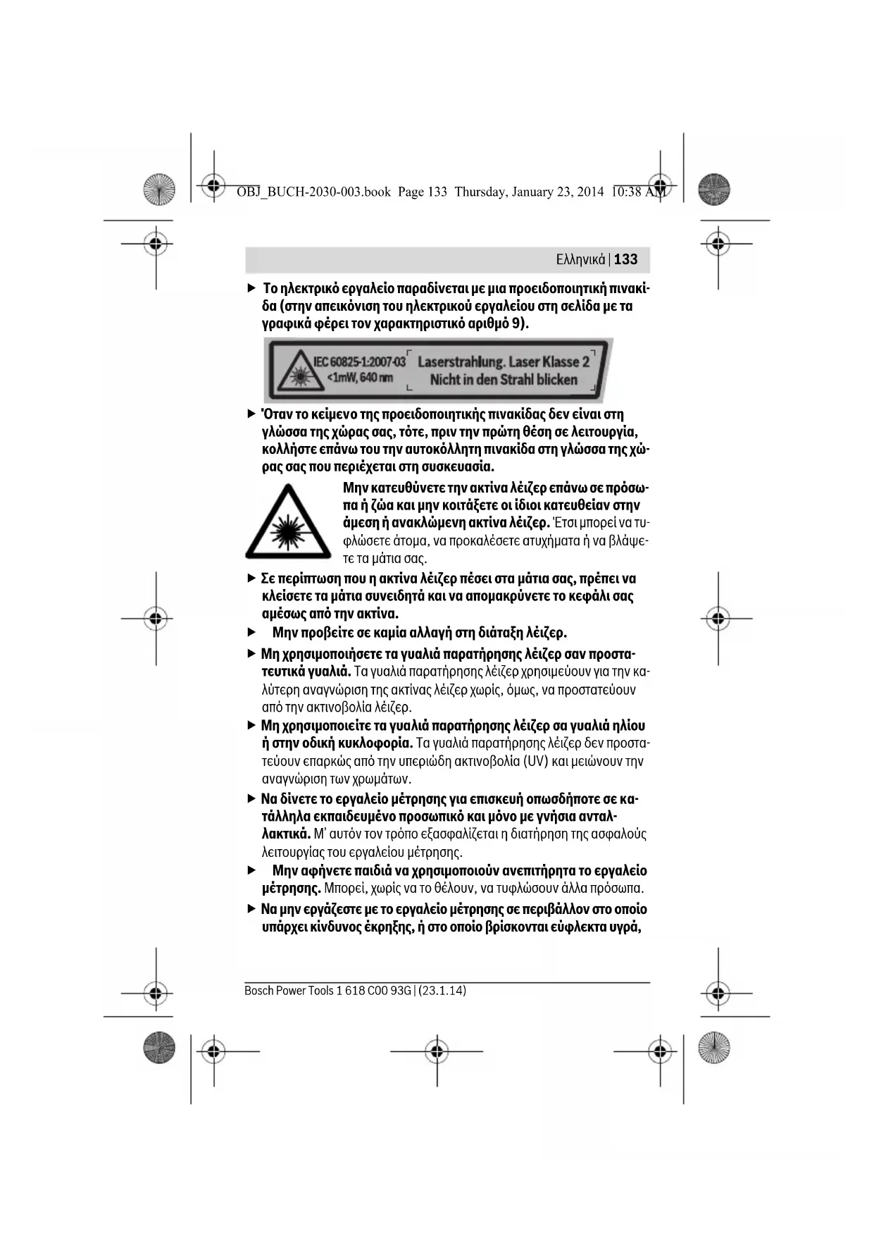 Υποδείξεις ασφαλείας Για να εργαστείτε με το όργανο μέτρησης χωρίς κίνδυνο και με ασφάλεια, πρέπει να διαβάσετε και να τηρήσετε όλες τις υποδείξεις. Μην καταστρέψετε ποτέ τις προειδοποιητικές πινακίδες που βρίσκονται στο όργανο μέτρησης. ΦΥΛΑΞΤΕ ΚΑΛΑ ΑΥΤΕΣ ΤΙΣ ΥΠΟΔΕΙΞΕΙΣ ΚΑΙ ΔΩΣΤΕ ΤΙΣ ΣΕ ΠΕΡΙΠΤΩΣΗ ΠΟΥ ΧΡΕΙΑΣΤΕΙ ΜΑΖΙ ΜΕ ΤΟ ΟΡΓΑΝΟ ΜΕΤΡΗΣΗΣ. Προσοχή – όταν εφαρμοστούν διαφορετικές διατάξεις χειρισμού και ρύθμισης ή ακολουθηθούν διαφορετικές διαδικασίες απ’ αυτές που αναφέρονται εδώ: αυτό μπορεί να οδηγήσει σε έκθεση σε επι- κίνδυνη ακτινοβολία. OBJ_BUCH-2030-003.book Page 132 Thursday, January 23, 2014 10:38 AMΕλληνικά | 133 Bosch Power Tools 1 618 C00 93G | (23.1.14) Το ηλεκτρικό εργαλείο παραδίνεται με μια προειδοποιητική πινακί- δα (στην απεικόνιση του ηλεκτρικού εργαλείου στη σελίδα με τα γραφικά φέρει τον χαρακτηριστικό αριθμό 9). Όταν το κείμενο της προειδοποιητικής πινακίδας δεν είναι στη γλώσσα της χώρας σας, τότε, πριν την πρώτη θέση σε λειτουργία, κολλήστε επάνω του την αυτοκόλλητη πινακίδα στη γλώσσα της χώ- ρας σας που περιέχεται στη συσκευασία. Μην κατευθύνετε την ακτίνα λέιζερ επάνω σε πρόσω- πα ή ζώα και μην κοιτάξετε οι ίδιοι κατευθείαν στην άμεση ή ανακλώμενη ακτίνα λέιζερ. Έτσι μπορεί να τυ- φλώσετε άτομα, να προκαλέσετε ατυχήματα ή να βλάψε- τε τα μάτια σας. Σε περίπτωση που η ακτίνα λέιζερ πέσει στα μάτια σας, πρέπει να κλείσετε τα μάτια συνειδητά και να απομακρύνετε το κεφάλι σας αμέσως από την ακτίνα. Μην προβείτε σε καμία αλλαγή στη διάταξη λέιζερ. Μη χρησιμοποιήσετε τα γυαλιά παρατήρησης λέιζερ σαν προστα- τευτικά γυαλιά. Τα γυαλιά παρατήρησης λέιζερ χρησιμεύουν για την κα- λύτερη αναγνώριση της ακτίνας λέιζερ χωρίς, όμως, να προστατεύουν από την ακτινοβολία λέιζερ. Μη χρησιμοποιείτε τα γυαλιά παρατήρησης λέιζερ σα γυαλιά ηλίου ή στην οδική κυκλοφορία. Τα γυαλιά παρατήρησης λέιζερ δεν προστα- τεύουν επαρκώς από την υπεριώδη ακτινοβολία (UV) και μειώνουν την αναγνώριση των χρωμάτων. Να δίνετε το εργαλείο μέτρησης για επισκευή οπωσδήποτε σε κα- τάλληλα εκπαιδευμένο προσωπικό και μόνο με γνήσια ανταλ- λακτικά. Μ’ αυτόν τον τρόπο εξασφαλίζεται η διατήρηση της ασφαλούς λειτουργίας του εργαλείου μέτρησης. Μην αφήνετε παιδιά να χρησιμοποιούν ανεπιτήρητα το εργαλείο μέτρησης. Μπορεί, χωρίς να το θέλουν, να τυφλώσουν άλλα πρόσωπα. Να μην εργάζεστε με το εργαλείο μέτρησης σε περιβάλλον στο οποίο υπάρχει κίνδυνος έκρηξης, ή στο οποίο βρίσκονται εύφλεκτα υγρά, OBJ_BUCH-2030-003.book Page 133 Thursday, January 23, 2014 10:38 AM134 | Ελληνικά 1 618 C00 93G | (23.1.14) Bosch Power Tools αέρια ή σκόνες. Στο εσωτερικό του εργαλείου μέτρησης μπορεί να δημι- ουργηθεί σπινθηρισμός κι έτσι να αναφλεχθούν η σκόνη ή οι αναθυμιάσεις. Να μην πλησιάζετε το εργαλείο μέτρησης σε βηματο- δότες. Ο μαγνήτης στο εσωτερικό του εργαλείου μέτρη- σης παράγει ένα μαγνητικό πεδίο το οποίο μπορεί να επη- ρεάσει τη λειτουργία των βηματοδοτών. Να μην πλησιάζετε το εργαλείο μέτρησης σε φορείς δεδομένων και σε συσκευές ευαίσθητες στο μαγνητισμό. Η δράση του μαγνήτη μπο- ρεί να προκαλέσει οριστική απώλεια των δεδομένων. Περιγραφή του προϊόντος και της ισχύος του Χρήση σύμφωνα με τον προορισμό Το όργανο μέτρησης προορίζεται για τον προσδιορισμό και τον έλεγχο ορι- ζόντιων και κάθετων γραμμών καθώς και γραμμών σε μια ορισμένη γωνία. Επιπλέον το όργανο μέτρησης προορίζεται για τον προσδιορισμό των γωνι- ών των αντικειμένων. Το εργαλείο μέτρησης προορ