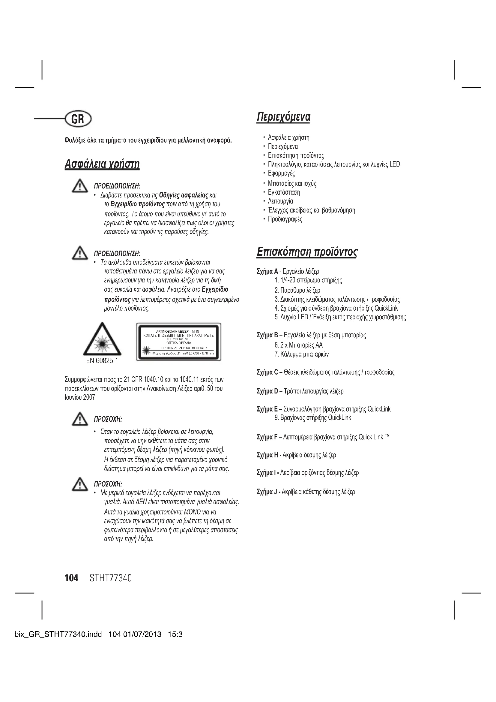 - Ταακόλουθαυποδείγματαετικετώνβρίσκονται τοποθετημέναπάνωστοεργαλείολέιζεργιανασας ενημερώσουνγιατηνκατηγορίαλέιζεργιατηδική σαςευκολίακαιασφάλεια.ΑνατρέξτεστοΕγχειρίδιο προϊόντοςγιαλεπτομέρειεςσχετικάμεένασυγκεκριμένο μοντέλοπροϊόντος. ΑΚΤΙΝΟΒΟΛΙΑ ΛΕΙΖΕΡ – ΜΗΝ ΚΟΙΤΑΤΕ ΤΗ ΔΕΣΜΗ Ή ΜΗΝ ΤΗΝ ΠΑΡΑΤΗΡΕΙΤΕ ΑΠΕΥΘΕΙΑΣ ΜΕ ΟΠΤΙΚΑ ΟΡΓΑΝΑ ΠΡΟΪΟΝ ΛΕΪΖΕΡ ΚΑΤΗΓΟΡΙΑΣ 1 Μέγιστη έξοδος ≤1 mW @ 630 - 670 nm EN 60825-1 Συμμορφώνεται προς το 21 CFR 1040.10 και το 1040.11 εκτός των παρεκκλίσεων που ορίζονται στην Ανακοίνωση Λέιζερ αριθ. 50 του Ιουνίου 2007
