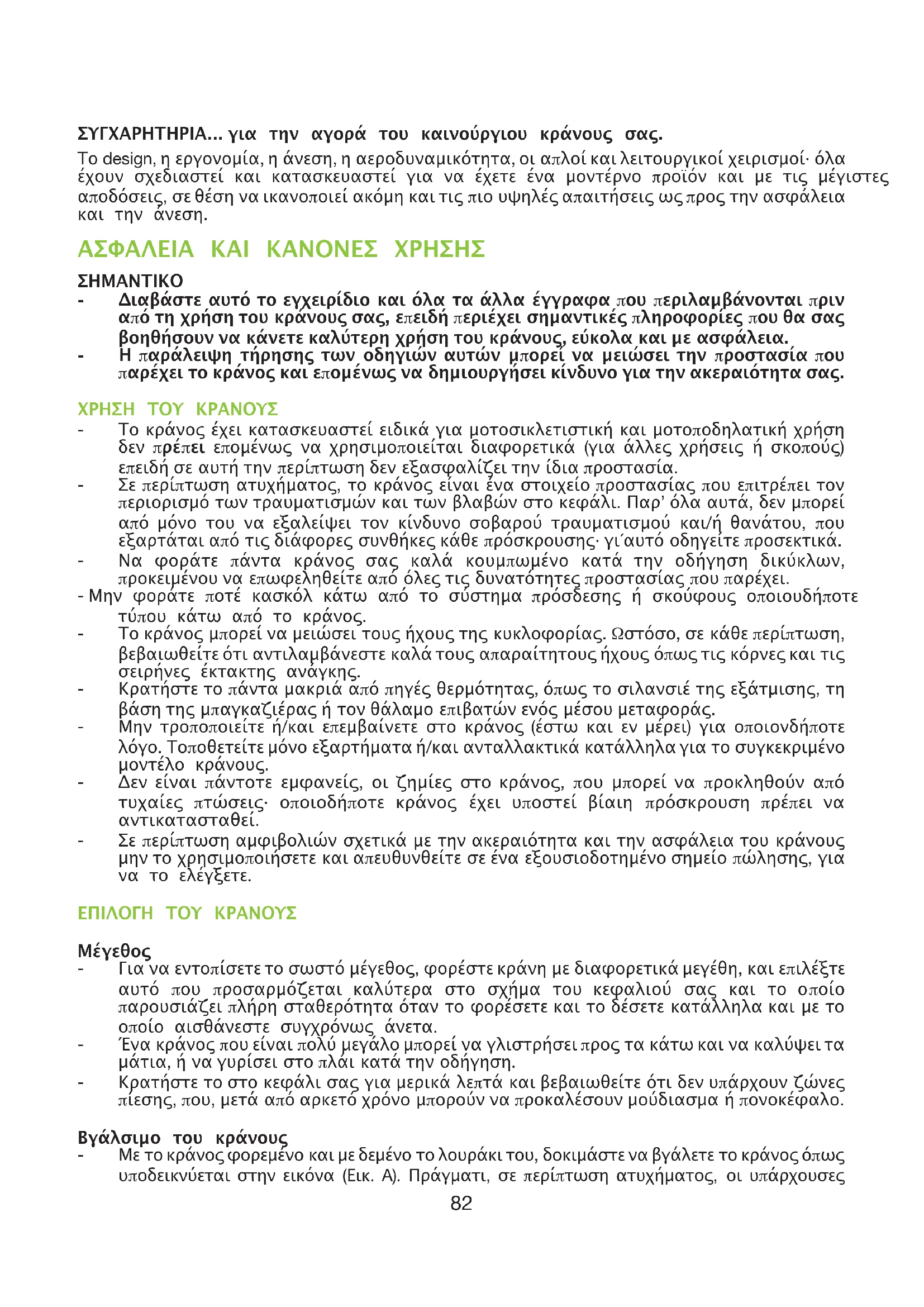 ΣΥΓΧΑΡΗΤΗΡΙΑ… για την αγορά του καινούργιου κράνους σας. Το design, η εργονοµία, η άνεση, η αεροδυναµικότητα, οι απλοί και λειτουργικοί χειρισµοί· όλα έχουν σχεδιαστεί και κατασκευαστεί για να έχετε ένα µοντέρνο προϊόν και µε τις µέγιστες αποδόσεις, σε θέση να ικανοποιεί ακόµη και τις πιο υψηλές απαιτήσεις ως προς την ασφάλεια και την άνεση. ΑΣΦΑΛΕΙΑ ΚΑΙ ΚΑΝΟΝΕΣ ΧΡΗΣΗΣ