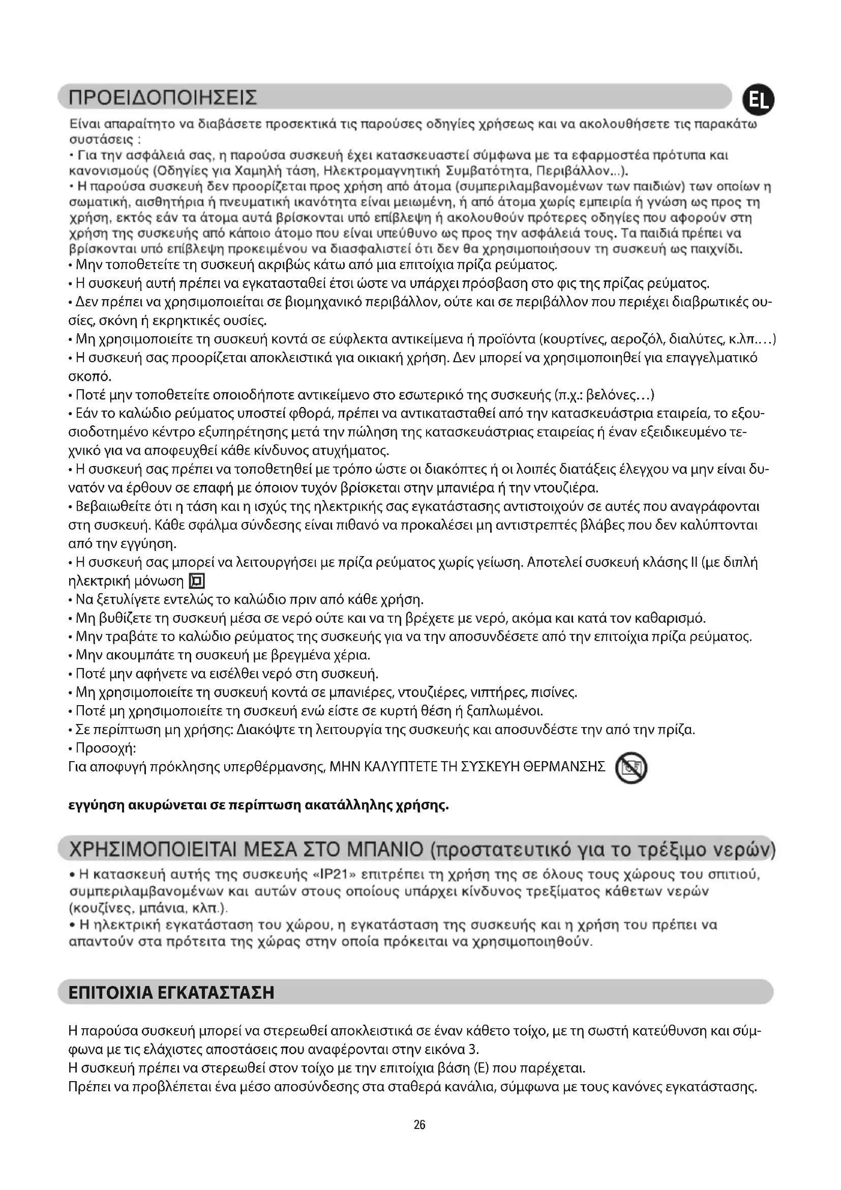 - Η συσκευή σας πρέπει να τοποθετηθεί με τρόπο ώστε οι διακόπτες ή οι λοιπές διατάξεις έλεγχου να μην είναι δυ- νατόν να έρθουν σε επαφή με όποιον τυχόν βρίσκεται στην μπανιέρα ή την ντουζιέρα.