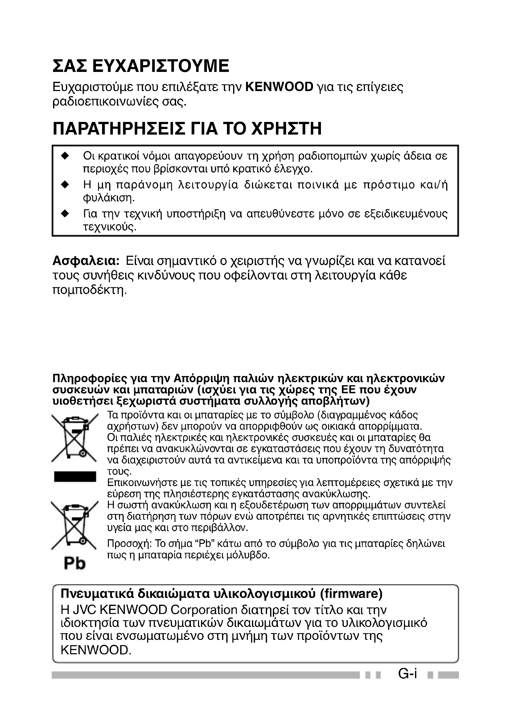 Ασφαλεια: Είναι σημαντικό ο χειριστής να γνωρίζει και να κατανοεί τους συνήθεις κινδύνους που οφείλονται στη λειτουργία κάθε πομποδέκτη. Πνευματικά δικαιώματα υλικολογισμικού (firmware) Η JVC KENWOOD Corporation διατηρεί τον τίτλο και την ιδιοκτησία των πνευματικών δικαιωμάτων για το υλικολογισμικό που είναι ενσωματωμένο στη μνήμη των προϊόντων της KENWOOD. Πληροφορίες για την Απόρριψη παλιών ηλεκτρικών και ηλεκτρονικών συσκευών και μπαταριών (ισχύει για τις χώρες της ΕΕ που έχουν υιοθετήσει ξεχωριστά συστήματα συλλογής αποβλήτων) Τα προϊόντα και οι μπαταρίες με το σύμβολο (διαγραμμένος κάδος αχρήστων) δεν μπορούν να απορριφθούν ως οικιακά απορρίμματα. Οι παλιές ηλεκτρικές και ηλεκτρονικές συσκευές και οι μπαταρίες θα πρέπει να ανακυκλώνονται σε εγκαταστάσεις που έχουν τη δυνατότητα να διαχειριστούν αυτά τα αντικείμενα και τα υποπροϊόντα της απόρριψής