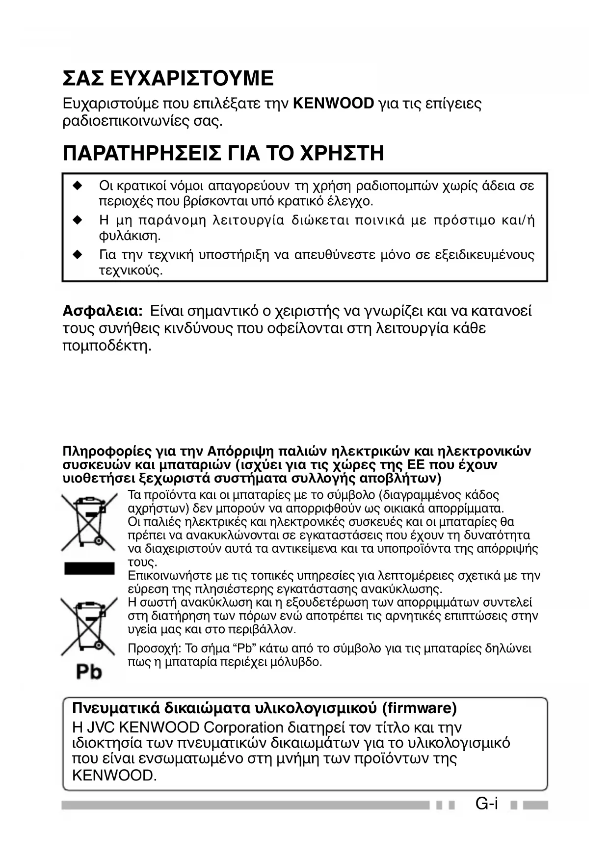 Ασφαλεια: Είναι σημαντικό ο χειριστής να γνωρίζει και να κατανοεί τους συνήθεις κινδύνους που οφείλονται στη λειτουργία κάθε πομποδέκτη. Πνευματικά δικαιώματα υλικολογισμικού (firmware) Η JVC KENWOOD Corporation διατηρεί τον τίτλο και την ιδιοκτησία των πνευματικών δικαιωμάτων για το υλικολογισμικό που είναι ενσωματωμένο στη μνήμη των προϊόντων της KENWOOD. Πληροφορίες για την Απόρριψη παλιών ηλεκτρικών και ηλεκτρονικών συσκευών και μπαταριών (ισχύει για τις χώρες της ΕΕ που έχουν υιοθετήσει ξεχωριστά συστήματα συλλογής αποβλήτων) Τα προϊόντα και οι μπαταρίες με το σύμβολο (διαγραμμένος κάδος αχρήστων) δεν μπορούν να απορριφθούν ως οικιακά απορρίμματα. Οι παλιές ηλεκτρικές και ηλεκτρονικές συσκευές και οι μπαταρίες θα πρέπει να ανακυκλώνονται σε εγκαταστάσεις που έχουν τη δυνατότητα να διαχειριστούν αυτά τα αντικείμενα και τα υποπροϊόντα της απόρριψής