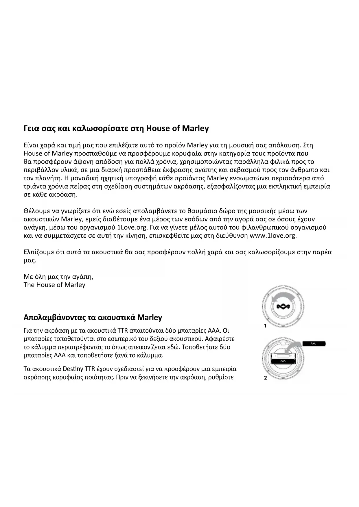 Με όλη μας την αγάπη, The House of Marley Απολαμβάνοντας τα ακουστικά Marley Για την ακρόαση με τα ακουστικά TTR απαιτούνται δύο μπαταρίες AAA. Οι μπαταρίες τοποθετούνται στο εσωτερικό του δεξιού ακουστικού. Αφαιρέστε το κάλυμμα περιστρέφοντάς το όπως απεικονίζεται εδώ. Τοποθετήστε δύο μπαταρίες AAA και τοποθετήστε ξανά το κάλυμμα. Τα ακουστικά Desny TTR έχουν σχεδιαστεί για να προσφέρουν μια εμπειρία ακρόασης κορυφαίας ποιότητας. Πριν να ξεκινήσετε την ακρόαση, ρυθμίστε AAA AAA