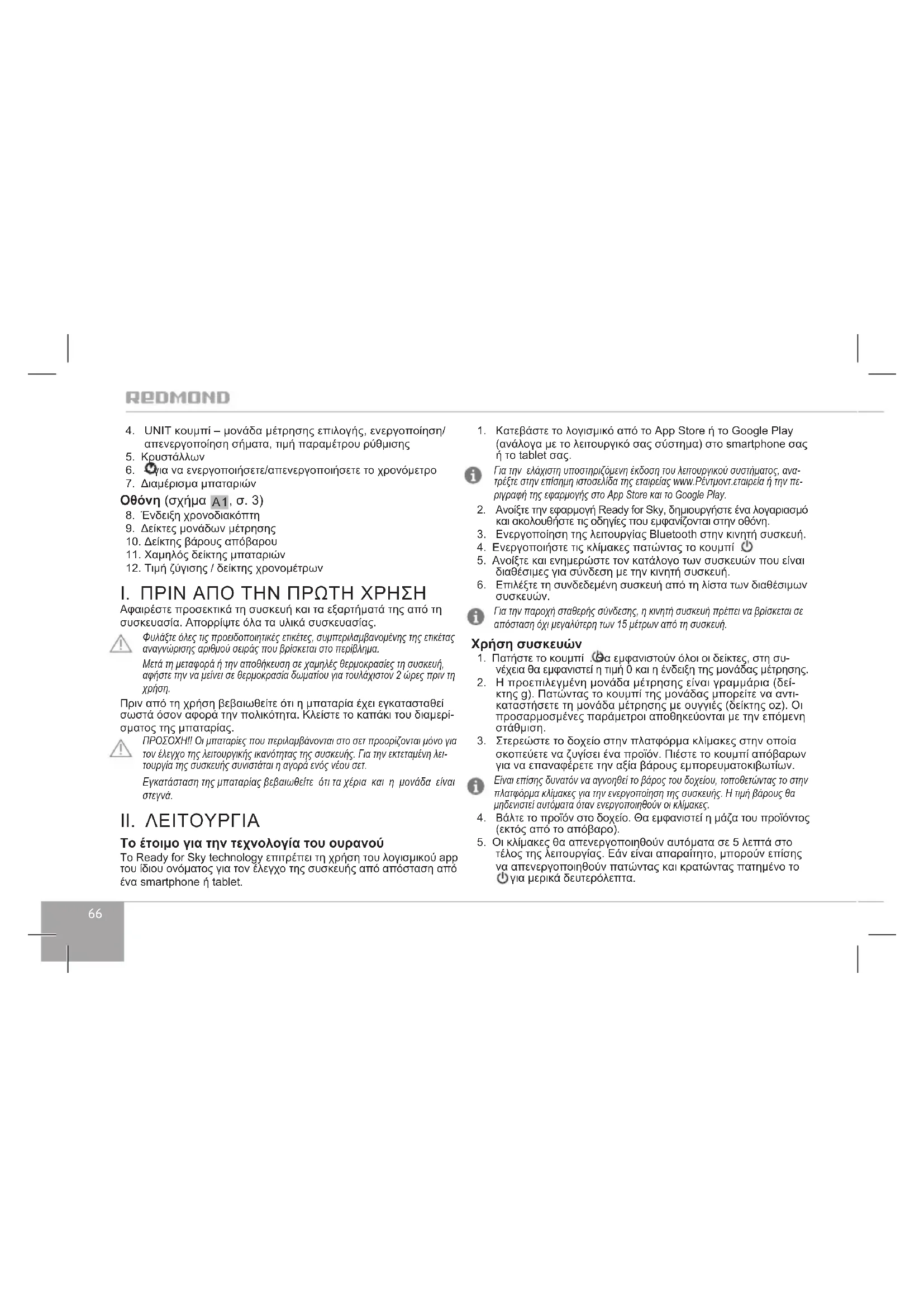 - Βασική εγγύηση είναι 1 έτος. Έπιπλέον ένα χρόνο δωρεάν σέρβις παρέχεται μετά την εγγραφή στην εφαρμογή Ready for Sky. Πληροφορίες σχετικά με τους όρους για τη χώρα είναι διαθέσιμη στην ιστοσελίδα https://r4s.redmond.company Η εγγύηση 1 + 1 είναι διαθέσιμη για μια περιορισμένη λίστα χωρών. Οικολογικά ακίνδυνη ανακύκλωση (ανακύκλωση ηλεκτρικού και ηλεκτρονικού εξοπλισμού) Η συσκευασία, το εγχειρίδιο χρήσης και η ίδια η συσκευή πρέπει να λαμβάνονται στο κατάλληλο σημείο συλλογής για την ανακύκλωση ηλεκτρικού και ηλεκτρονικού εξοπλισμού. Μην πετάτε τα ηλεκτρονικά απόβλητα για να προστατεύσετε το περιβάλλον. Παλιές συσκευές δεν πρέπει να απορρίπτονται μαζί με άλλα οικιακά απορρίμματα, αλλά πρέπει να συλλέγονται ξεχωριστά. Η Δημοτική διάθεση ανακυκλώσιμων αποβλήτων είναι δωρεάν. Οι ιδιοκτήτες παλαιών συσκευών υποχρεούνται να το φέρουν σε Κέντρο εγκαταστάσεων αποβλήτων. Με αυτή τη μικρή επιπλέον προσπάθεια, μπορείτε να βοηθήσετε να εξασφαλιστεί ότι οι πολύτιμες πρώτες ύλες ανακυκλώνονται και οι ρύποι αντιμετωπίζονται όπως αρμόζει. Η συσκευή αυτή έχει σημανθεί σύμφωνα με την Έυρωπαϊκή Οδηγία 2012/19/ΈΈ σχετικά με χρησιμοποιημένων ηλεκτρικών και ηλεκτρονικών συσκευών (απόβλητα ηλεκτρικού και Ηλεκτρονικού Έξοπλισμού). Η κατευθυντήρια γραμμή καθορίζει το πλαίσιο για την επιστροφή και την ανακύκλωση χρησιμοποιημένων συσκευών που ισχύει σε όλη την ΈΈ. Bluetooth είναι το σήμα κατατεθέν της Bluetooth SIG, Inc. App Store είναι το σήμα υπηρεσίας της Apple Inc., εγγεγραμμένος στις ΗΠΑ και άλλες χώρες. Google Play είναι το σήμα κατατεθέν της Google Inc.SkyScales RS-741S-E