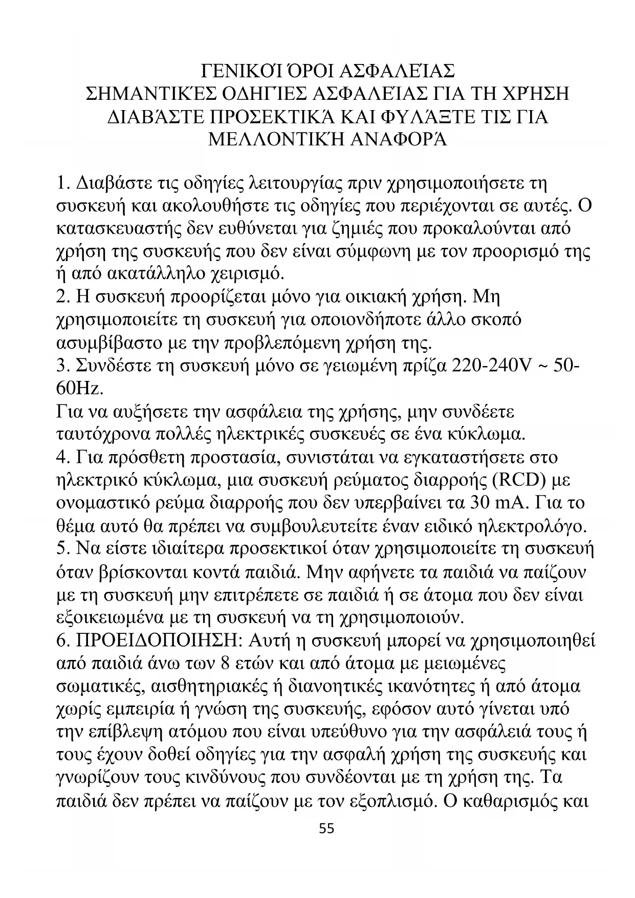 60Hz. Για να αυξήσετε την ασφάλεια της χρήσης, μην συνδέετε ταυτόχρονα πολλές ηλεκτρικές συσκευές σε ένα κύκλωμα.