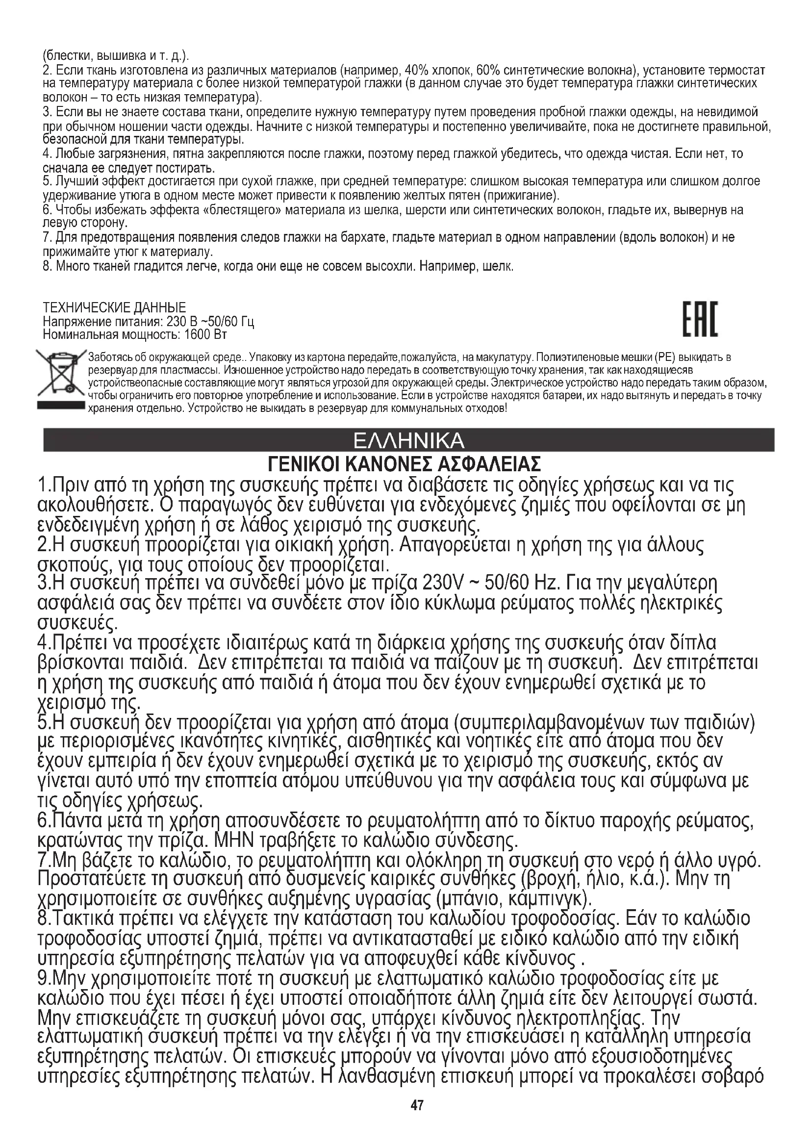 ΓΕΝΙΚΟΙ ΚΑΝΟΝΕΣ ΑΣΦΑΛΕΙΑΣ 1.Πριν από τη χρήση της συσκευής πρέπει να διαβάσετε τις οδηγίες χρήσεως και να τις ακολουθήσετε. Ο παραγωγός δεν ευθύνεται για ενδεχόμενες ζημιές που οφείλονται σε μη ενδεδειγμένη χρήση ή σε λάθος χειρισμό της συσκευής. 2.Η συσκευή προορίζεται για οικιακή χρήση. Απαγορεύεται η χρήση της για άλλους σκοπούς, για τους οποίους δεν προορίζεται. 5.Η συσκευή δεν προορίζεται για χρήση από άτομα (συμπεριλαμβανομένων των παιδιών) με περιορισμένες ικανότητες κινητικές, αισθητικές και νοητικές είτε από άτομα που δεν έχουν εμπειρία ή δεν έχουν ενημερωθεί σχετικά με το χειρισμό της συσκευής, εκτός αν γίνεται αυτό υπό την εποπτεία ατόμου υπεύθυνου για την ασφάλεια τους και σύμφωνα με τις οδηγίες χρήσεως. 6.Πάντα μετά τη χρήση αποσυνδέσετε το ρευματολήπτη από το δίκτυο παροχής ρεύματος, κρατώντας την πρίζα. ΜΗΝ τραβήξετε το καλώδιο σύνδεσης. 4.Πρέπει να προσέχετε ιδιαιτέρως κατά τη διάρκεια χρήσης της συσκευής όταν δίπλα βρίσκονται παιδιά. Δεν επιτρέπεται τα παιδιά να παίζουν με τη συσκευή. Δεν επιτρέπεται η χρήση της συσκευής από παιδιά ή άτομα που δεν έχουν ενημερωθεί σχετικά με το χειρισμό της. 8.Τακτικά πρέπει να ελέγχετε την κατάσταση του καλωδίου τροφοδοσίας. Εάν το καλώδιο τροφοδοσίας υποστεί ζημιά, πρέπει να αντικατασταθεί με ειδικό καλώδιο από την ειδική υπηρεσία εξυπηρέτησης πελατών για να αποφευχθεί κάθε κίνδυνος . 9.Μην χρησιμοποιείτε ποτέ τη συσκευή με ελαττωματικό καλώδιο τροφοδοσίας είτε με καλώδιο που έχει πέσει ή έχει υποστεί οποιαδήποτε άλλη ζημιά είτε δεν λειτουργεί σωστά. Μην επισκευάζετε τη συσκευή μόνοι σας, υπάρχει κίνδυνος ηλεκτροπληξίας. Την ελαττωματική συσκευή πρέπει να την ελέγξει ή να την επισκευάσει η κατάλληλη υπηρεσία εξυπηρέτησης πελατών. Οι επισκευές μπορούν να γίνονται μόνο από εξουσιοδοτημένες υπηρεσίες εξυπηρέτησης πελατών. Η λανθασμένη επισκευή μπορεί να προκαλέσει σοβαρό 7.Μη βάζετε το καλώδιο, το ρευματολήπτη και ολόκληρη τη συσκευή στο νερό ή άλλο υγρό. Προστατεύετε τη συσκευή από δυσμενείς καιρικές συνθήκες (βροχή, ήλιο, κ.ά.). Μην τη χρησιμοποιείτε σε συνθήκες αυξημένης υγρασίας (μπάνιο, κάμπινγκ). 3.Η συσκευή πρέπει να συνδεθεί μόνο με πρίζα 230V ~ 50/60 Hz. Για την μεγαλύτερη ασφάλειά σας δεν πρέπει να συνδέετε στον ίδιο κύκλωμα ρεύματος πολλές ηλεκτρικές συσκευές.B. Κουμπί εκτόζευσης ατμού 13.Μην αφήνετε τη συσκευή συνδεδεμένη με το δίκτυο παροχής ρεύματος χωρίς επίβλεψη. ΠΕΡΙΓΡΑΦΗ ΠΡΟΪΟΝΤΟΣ (εικ. 1) D. Περιστρεφόμενη δίοδος καλωδίου E. Κουμπί θερμοστάτη – ρύθμισμης θερμοκρασίας 11.Μη χρησιμοποιείτε ποτέ τη συσκευή πλάι σε εύφλεκτα υλικά. κίνδυνο για τους χρήστες.