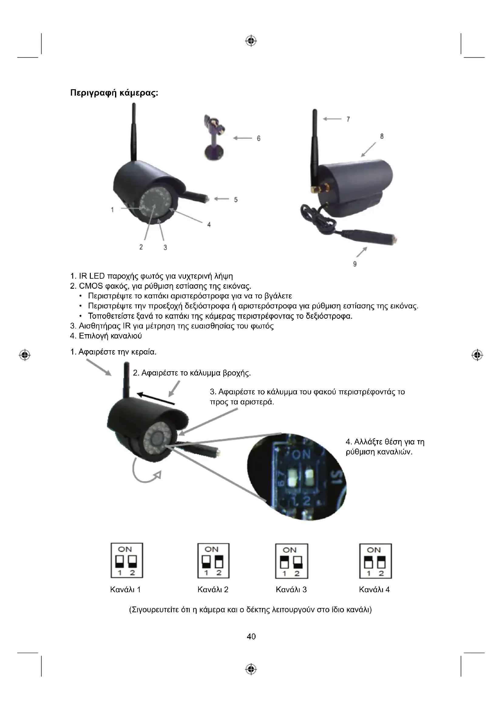 Κανάλι 1 Κανάλι 2 Κανάλι 3 Κανάλι 4 (Σιγουρευτείτε ότι η κάμερα και ο δέκτης λειτουργούν στο ίδιο κανάλι)