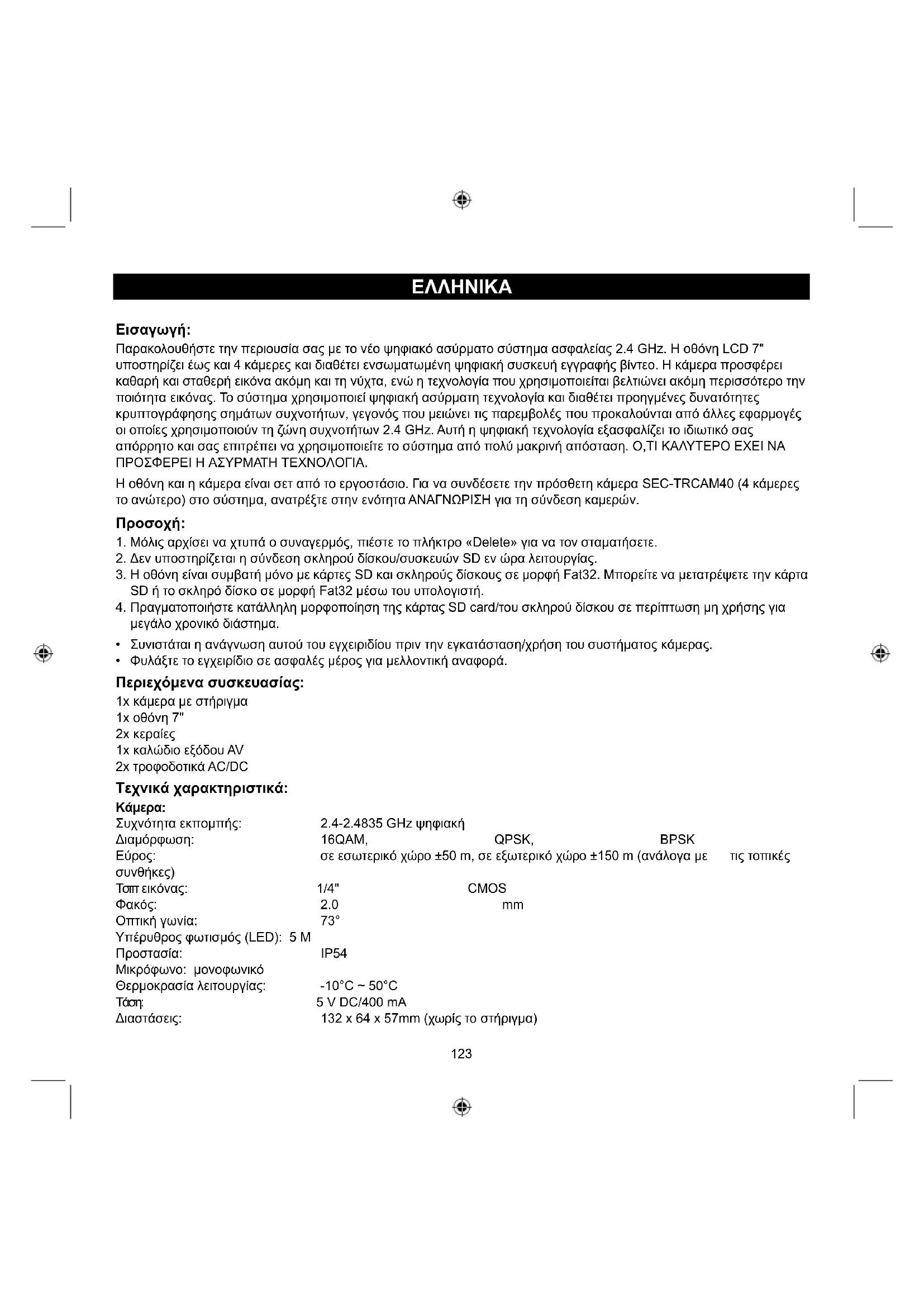 - Φυλάξτε το εγχειρίδιο σε ασφαλές μέρος για μελλοντική αναφορά. Περιεχόμενα συσκευασίας: 1x κάμερα με στήριγμα 1x οθόνη 7" 2x κεραίες 1x καλώδιο εξόδου AV 2x τροφοδοτικά AC/DC Τεχνικά χαρακτηριστικά:
