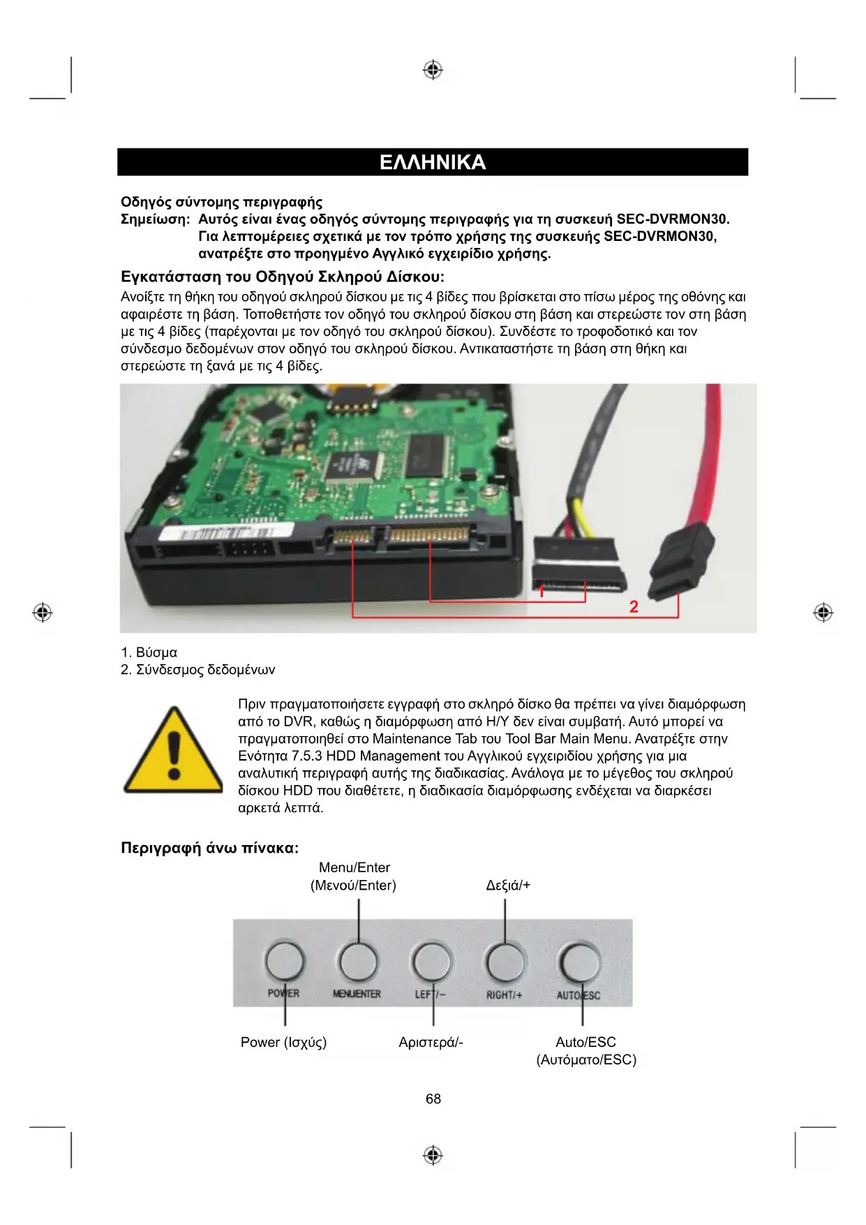ceste produse au un sistem separat de colectare.68 ΕΛΛΗΝΙΚA Οθόνη 15” με DVR Οδηγός σύντομης περιγραφής Σημείωση: Αυτός είναι ένας οδηγός σύντομης περιγραφής για τη συσκευή SEC-DVRMON30. Για λεπτομέρειες σχετικά με τον τρόπο χρήσης της συσκευής SEC-DVRMON30, ανατρέξτε στο προηγμένο Αγγλικό εγχειρίδιο χρήσης. Εγκατάσταση του Οδηγού Σκληρού ∆ίσκου: Ανοίξτε τη θήκη του οδηγού σκληρού δίσκου με τις 4 βίδες που βρίσκεται στο πίσω μέρος της οθόνης και αφαιρέστε τη βάση. Τοποθετήστε τον οδηγό του σκληρού δίσκου στη βάση και στερεώστε τον στη βάση με τις 4 βίδες (παρέχονται με τον οδηγό του σκληρού δίσκου). Συνδέστε το τροφοδοτικό και τον σύνδεσμο δεδομένων στ ον οδηγό του σκληρού δίσκου. Αντικαταστήστε τη βάση στη θήκη και στερεώστε τη ξανά με τις 4 βίδες.