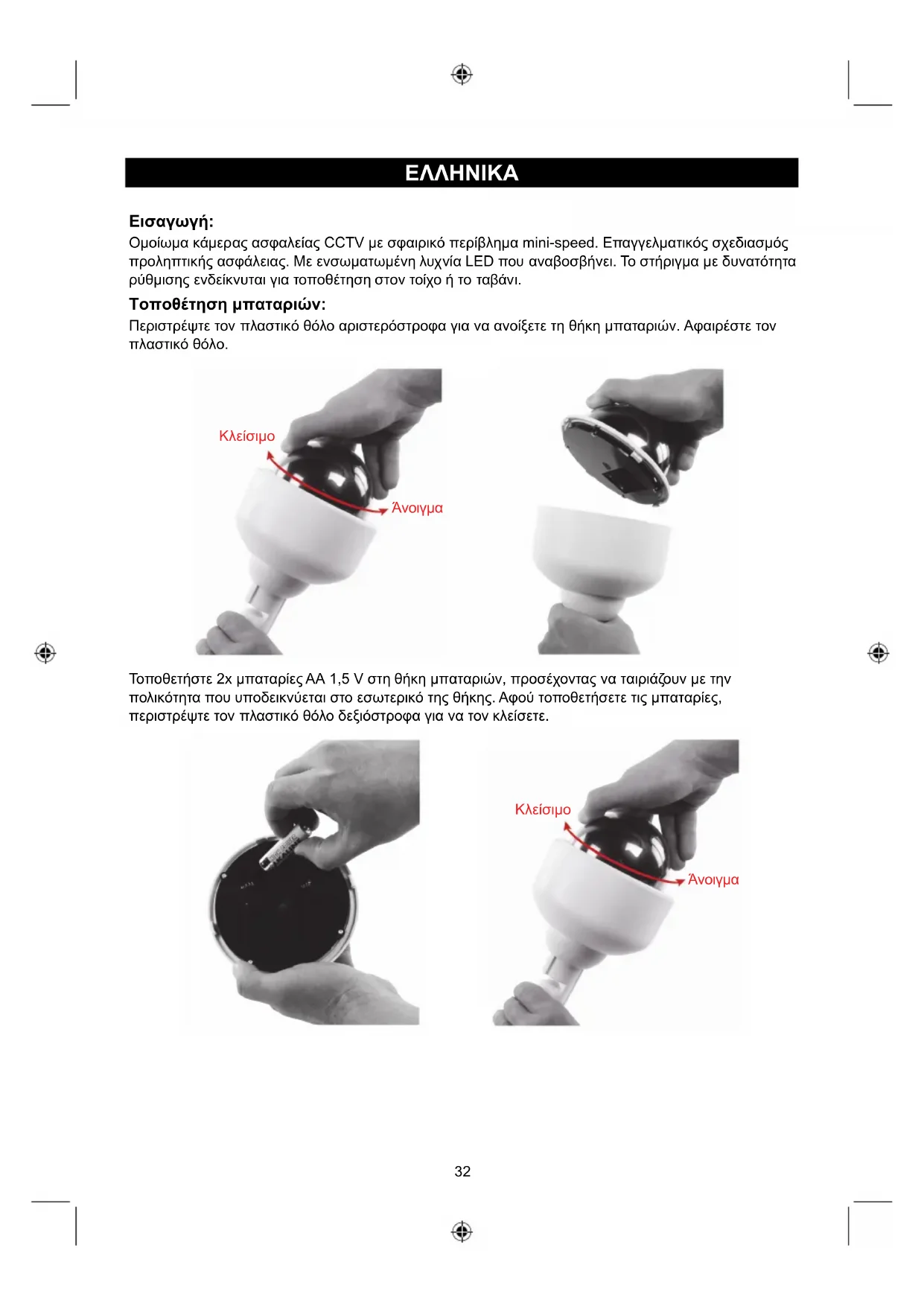 Ομοίωμα κάμερας ασφαλείας CCTV με σφαιρικό περίβλημα mini-speed. Επαγγελματικός σχεδιασμός προληπτικής ασφάλειας. Με ενσωματωμένη λυχνία LED που αναβοσβήνει. Το στήριγμα με δυνατότητα ρύθμισης ενδείκνυται για τοποθέτηση στον τοίχο ή το ταβάνι. Τοποθέτηση μπαταριών: Περιστρέψτε τον πλαστικό θόλο αριστερόστροφα για να ανοίξετε τη θήκη μπαταριών. Αφαιρέστε τον πλαστικό θόλο. Τοποθετήστε 2x μπαταρίες AA 1,5 V στη θήκη μπαταριών, προσέχοντας να ταιριάζουν με την πολικότητα που υποδεικνύεται στο εσωτερικό της θήκης. Αφού τοποθετήσετε τις μπαταρίες, περιστρέψτε τον πλαστικό θόλο δεξιόστροφα για να τον κλείσετε.