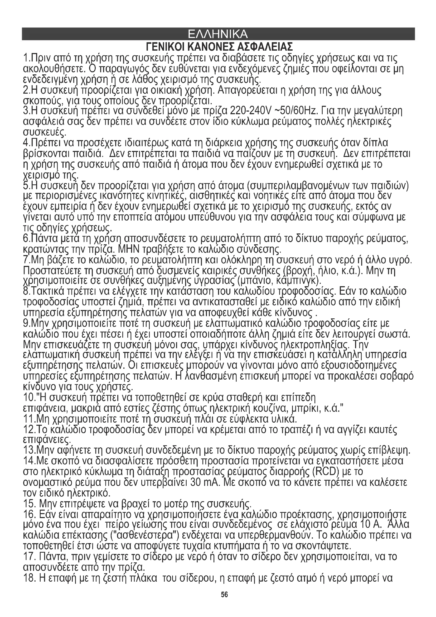 4.Πρέπει να προσέχετε ιδιαιτέρως κατά τη διάρκεια χρήσης της συσκευής όταν δίπλα βρίσκονται παιδιά. Δεν επιτρέπεται τα παιδιά να παίζουν με τη συσκευή. Δεν επιτρέπεται η χρήση της συσκευής από παιδιά ή άτομα που δεν έχουν ενημερωθεί σχετικά με το χειρισμό της. 5.Η συσκευή δεν προορίζεται για χρήση από άτομα (συμπεριλαμβανομένων των παιδιών) με περιορισμένες ικανότητες κινητικές, αισθητικές και νοητικές είτε από άτομα που δεν έχουν εμπειρία ή δεν έχουν ενημερωθεί σχετικά με το χειρισμό της συσκευής, εκτός αν γίνεται αυτό υπό την εποπτεία ατόμου υπεύθυνου για την ασφάλεια τους και σύμφωνα με τις οδηγίες χρήσεως. 6.Πάντα μετά τη χρήση αποσυνδέσετε το ρευματολήπτη από το δίκτυο παροχής ρεύματος, κρατώντας την πρίζα. ΜΗΝ τραβήξετε το καλώδιο σύνδεσης. 7.Μη βάζετε το καλώδιο, το ρευματολήπτη και ολόκληρη τη συσκευή στο νερό ή άλλο υγρό. Προστατεύετε τη συσκευή από δυσμενείς καιρικές συνθήκες (βροχή, ήλιο, κ.ά.). Μην τη χρησιμοποιείτε σε συνθήκες αυξημένης υγρασίας (μπάνιο, κάμπινγκ). 8.Τακτικά πρέπει να ελέγχετε την κατάσταση του καλωδίου τροφοδοσίας. Εάν το καλώδιο τροφοδοσίας υποστεί ζημιά, πρέπει να αντικατασταθεί με ειδικό καλώδιο από την ειδική υπηρεσία εξυπηρέτησης πελατών για να αποφευχθεί κάθε κίνδυνος . 9.Μην χρησιμοποιείτε ποτέ τη συσκευή με ελαττωματικό καλώδιο τροφοδοσίας είτε με καλώδιο που έχει πέσει ή έχει υποστεί οποιαδήποτε άλλη ζημιά είτε δεν λειτουργεί σωστά. Μην επισκευάζετε τη συσκευή μόνοι σας, υπάρχει κίνδυνος ηλεκτροπληξίας. Την ελαττωματική συσκευή πρέπει να την ελέγξει ή να την επισκευάσει η κατάλληλη υπηρεσία εξυπηρέτησης πελατών. Οι επισκευές μπορούν να γίνονται μόνο από εξουσιοδοτημένες υπηρεσίες εξυπηρέτησης πελατών. Η λανθασμένη επισκευή μπορεί να προκαλέσει σοβαρό κίνδυνο για τους χρήστες. 10."Η συσκευή πρέπει να τοποθετηθεί σε κρύα σταθερή και επίπεδη επιφάνεια, μακριά από εστίες ζέστης όπως ηλεκτρική κουζίνα, μπρίκι, κ.ά." 11.Μη χρησιμοποιείτε ποτέ τη συσκευή πλάι σε εύφλεκτα υλικά. 12.Το καλώδιο τροφοδοσίας δεν μπορεί να κρέμεται από το τραπέζι ή να αγγίζει καυτές επιφάνειες. 13.Μην αφήνετε τη συσκευή συνδεδεμένη με το δίκτυο παροχής ρεύματος χωρίς επίβλεψη. 14.Με σκοπό να διασφαλίσετε πρόσθετη προστασία προτείνεται να εγκαταστήσετε μέσα στο ηλεκτρικό κύκλωμα τη διάταξη προστασίας ρεύματος διαρροής (RCD) με το ονομαστικό ρεύμα που δεν υπερβαίνει 30 mA. Με σκοπό να το κάνετε πρέπει να καλέσετε τον ειδικό ηλεκτρικό.