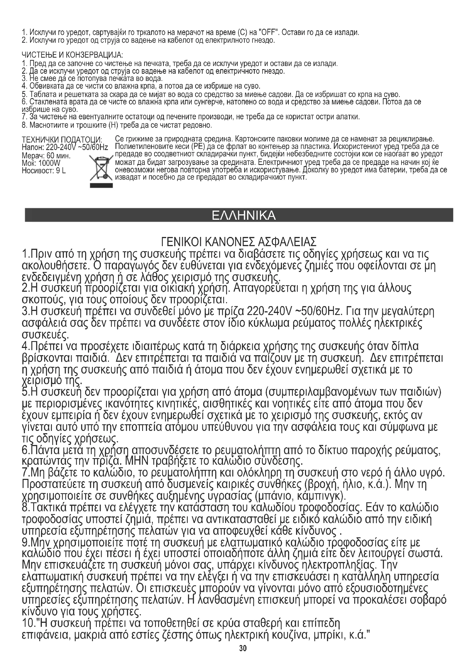 ТЕХНИЧКИ ПОДАТОЦИ: Напон: 220-240V ~50/60Hz Мерач: 60 мин. Моќ: 1000W Носивост: 9 L ΓΕΝΙΚΟΙ ΚΑΝΟΝΕΣ ΑΣΦΑΛΕΙΑΣ 1.Πριν από τη χρήση της συσκευής πρέπει να διαβάσετε τις οδηγίες χρήσεως και να τις ακολουθήσετε. Ο παραγωγός δεν ευθύνεται για ενδεχόμενες ζημιές που οφείλονται σε μη ενδεδειγμένη χρήση ή σε λάθος χειρισμό της συσκευής. 2.Η συσκευή προορίζεται για οικιακή χρήση. Απαγορεύεται η χρήση της για άλλους σκοπούς, για τους οποίους δεν προορίζεται. 3.Η συσκευή πρέπει να συνδεθεί μόνο με πρίζα 220-240V ~50/60Hz. Για την μεγαλύτερη ασφάλειά σας δεν πρέπει να συνδέετε στον ίδιο κύκλωμα ρεύματος πολλές ηλεκτρικές