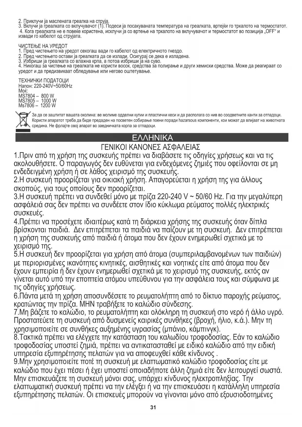 ΓΕΝΙΚΟΙ ΚΑΝΟΝΕΣ ΑΣΦΑΛΕΙΑΣ 1.Πριν από τη χρήση της συσκευής πρέπει να διαβάσετε τις οδηγίες χρήσεως και να τις ακολουθήσετε. Ο παραγωγός δεν ευθύνεται για ενδεχόμενες ζημιές που οφείλονται σε μη ενδεδειγμένη χρήση ή σε λάθος χειρισμό της συσκευής. 2.Η συσκευή προορίζεται για οικιακή χρήση. Απαγορεύεται η χρήση της για άλλους σκοπούς, για τους οποίους δεν προορίζεται. 3.Η συσκευή πρέπει να συνδεθεί μόνο με πρίζα 220-240 V ~ 50/60 Hz. Για την μεγαλύτερη ασφάλειά σας δεν πρέπει να συνδέετε στον ίδιο κύκλωμα ρεύματος πολλές ηλεκτρικές