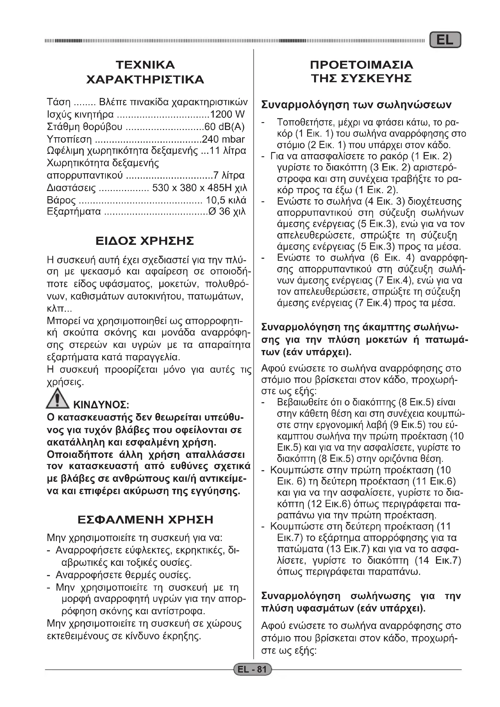 ΧΑΡΑΚΤΗΡΙΣΤΙΚΑ Τάση ........ Βλέπε πινακίδα χαρακτηριστικών Ισχύς κινητήρα .................................1200 W Στάθμη θορύβου ............................60 dB(A) Υποπίεση ......................................240 mbar Ωφέλιμη χωρητικότητα δεξαμενής ...11 λίτρα Χωρητικότητα δεξαμενής απορρυπαντικού ...............................7 λίτρα Διαστάσεις .................. 530 x 380 x 485H χιλ Βάρος ............................................ 10,5 κιλά Εξαρτήματα .....................................Ø 36 χιλ ΕΙΔΟΣ ΧΡΗΣΗΣ Η συσκευή αυτή έχει σχεδιαστεί για την πλύ- ση με ψεκασμό και αφαίρεση σε οποιοδή- ποτε είδος υφάσματος, μοκετών, πολυθρό- νων, καθισμάτων αυτοκινήτου, πατωμάτων,