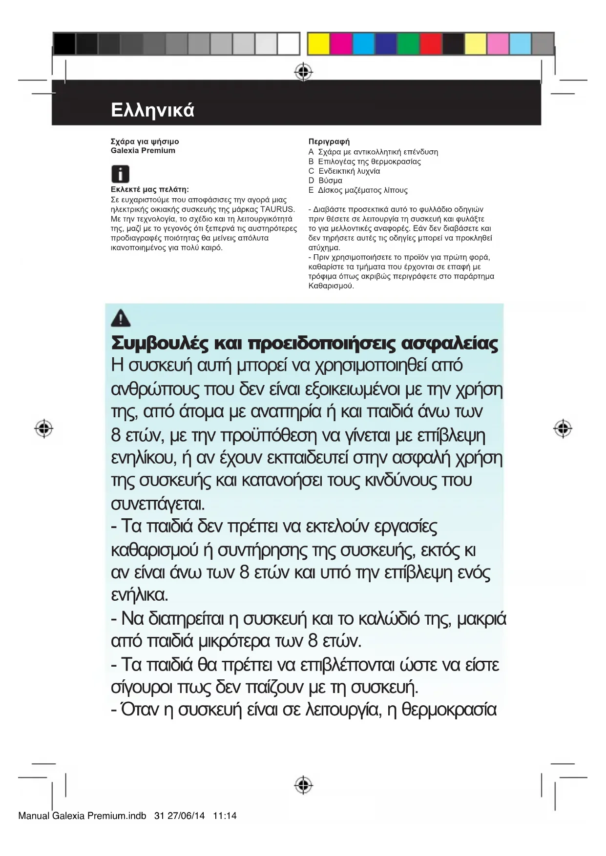 - Μην χρησιμοποιείτε την συσκευή όταν έχει βλάβη το καλώδιο ή η πρίζα. Χρήση και προσοχή: - Πριν από κάθε χρήση, ξετυλίξτε εντελώς το καλώδιο τροφοδοσίας της συσκευής. - Αποσυνδέστε την συσκευή από το ρεύμα, όταν δεν την χρησιμοποιείτε και πριν από την πραγματοποίηση οποιασδήποτε ενέργειας καθαρισμού. - Αυτή η συσκευή έχει σχεδιαστεί μόνο για οικιακή χρήση και όχι για επαγγελματική ή βιομηχανική. Manual Galexia Premium.indb 32 27/06/14 11:14- Κρατήστε αυτήν την συσκευή μακριά από τα παιδιά και/ή από άτομα με ειδικές ανάγκες. - Να μην φυλάτε την συσκευή, εάν είναι ακόμα ζεστή. - Τοποθετήστε το θερμοστατικό διακόπτη στη θέση ελάχιστο (MIN), δεν εξασφαλίζει τη μόνιμη αποσύνδεση της φριτέζας.