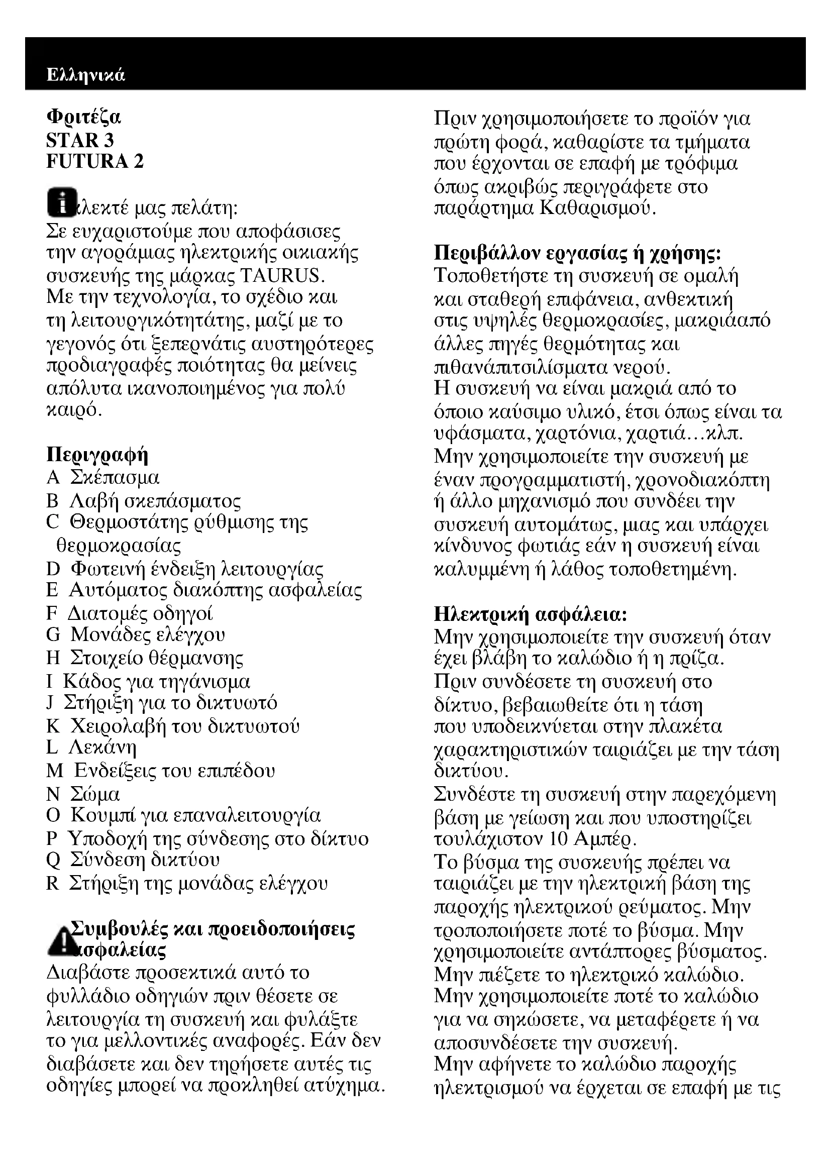 STAR 3 FUTURA 2 Εκλεκτέ μας πελάτη: Σε ευχαριστούμε που αποφάσισες την αγοράμιας ηλεκτρικής οικιακής συσκευής της μάρκας TAURUS. Με την τεχνολογία, το σχέδιο και τη λειτουργικότητάτης, μαζί με το γεγονός ότι ξεπερνάτις αυστηρότερες προδιαγραφές ποιότητας θα μείνεις απόλυτα ικανοποιημένος για πολύ