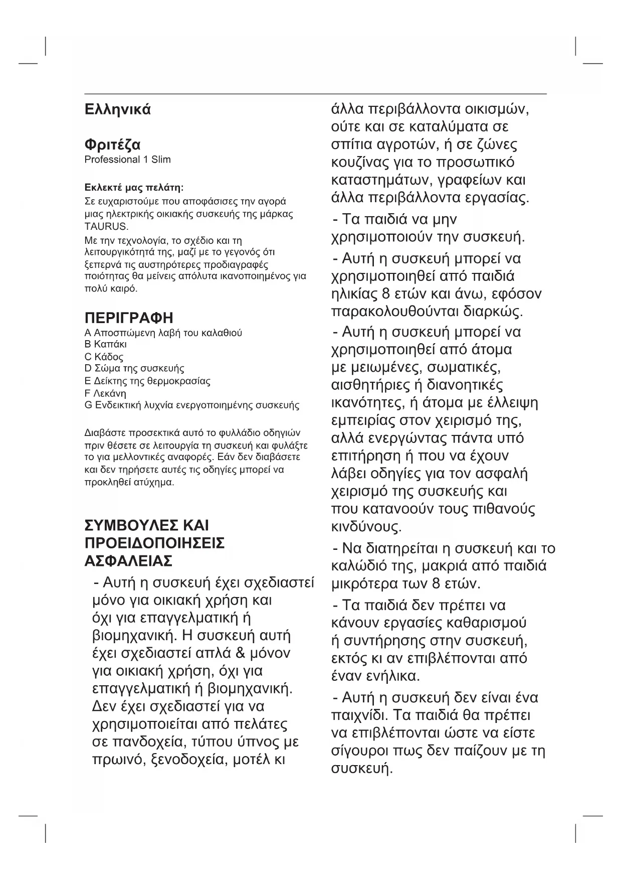 Professional 1 Slim - φριτέζα TAURUS - Δωρεάν εγχειρίδιο χρήσης