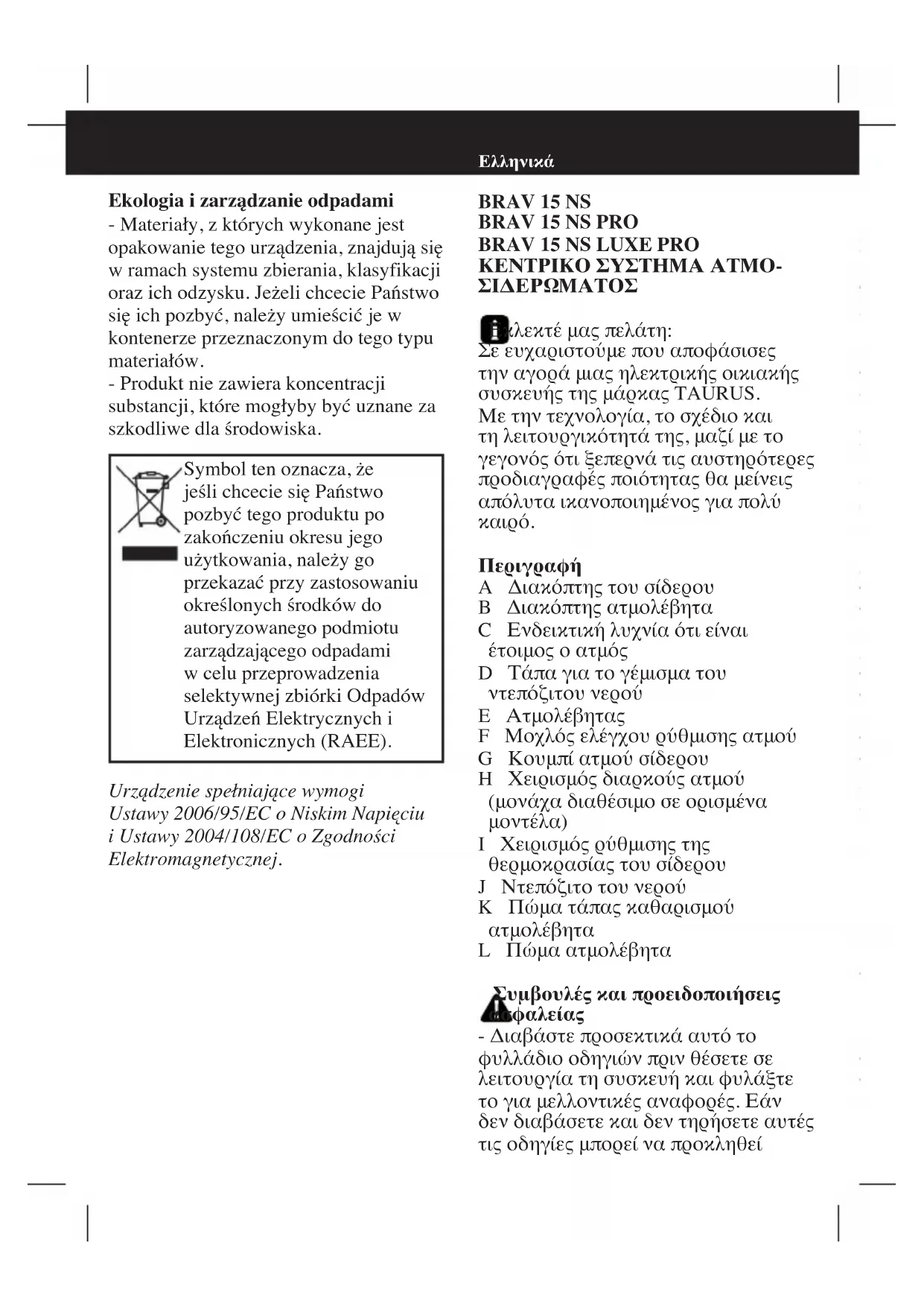 - Το προϊόν είναι απαλλαγμένο από συγκεντρώσεις συστατικών που μπορεί να θεωρηθούν βλαβερά για το περιβάλλον. Η παρούσα συσκευή πληροί την Οδηγία 2006/95/ΕΟΚ Χαμηλής Τάσης και την Οδηγία 2004/108/ΕΟΚ Ηλεκτρομαγνητικής Συμβατότητας. - Αυτό το σύμβολο σημαίνει πως εάν επιθυμείτε να πετάξετε το προϊόν μετά το πέρας ζωής του, θα πρέπει να το κάνετε με τον ενδεδειγμένο τρόπο μέσω ενός φορέα διαχείρισης αποβλήτων, εξουσιοδοτημένο για την επιλεκτική συλλογή Αποβλήτων Ηλεκτρικών και Ηλεκτρονικών Συσκευών (ΑΗΗΣ).Модель BRAV 15 NS Модель BRAV 15 NS PRO Модель BRAV 15 NS LUXE PRO ПАРОГЕНЕРАТОР Уважаемый покупатель: Благодарим Вас за то, что Вы остановили свой выбор на приборе марки TAURUS. Использование передовых технологий, современный дизайн, функциональность, а также соблюдение строгих требований к качеству гарантирует Вам продолжительную эксплуатацию
