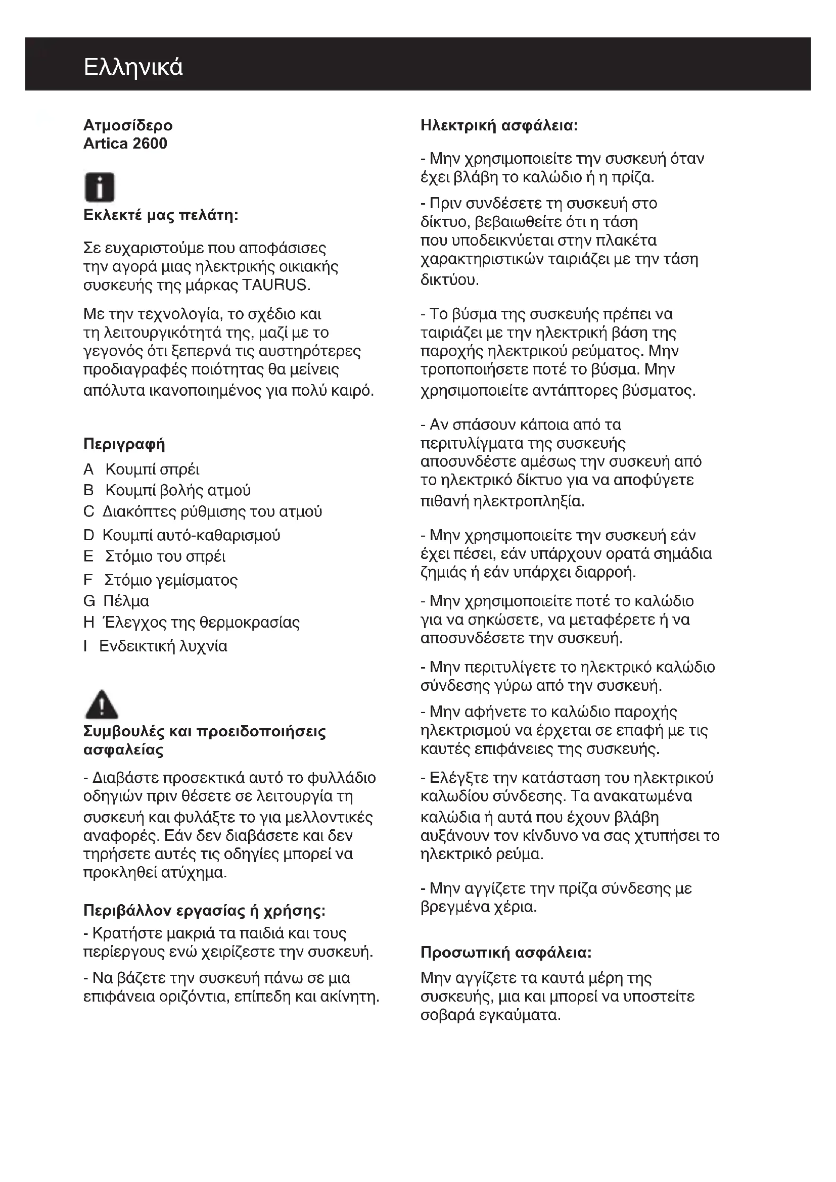 Artica 2600 Εκλεκτέ μας πελάτη: Σε ευχαριστούμε που αποφσισες την αγορ μιας ηλεκτρικής οικιακής συσκευής της μρκας TAURUS. Με την τεχνολογία, το σχέδιο και τη λειτουργικότητ της, μαζί με το γεγονός ότι ξεπερν τις αυστηρότερες προδιαγραφές ποιότητας θα μείνεις απόλυτα ικανοποιημένος για πολύ καιρό.
