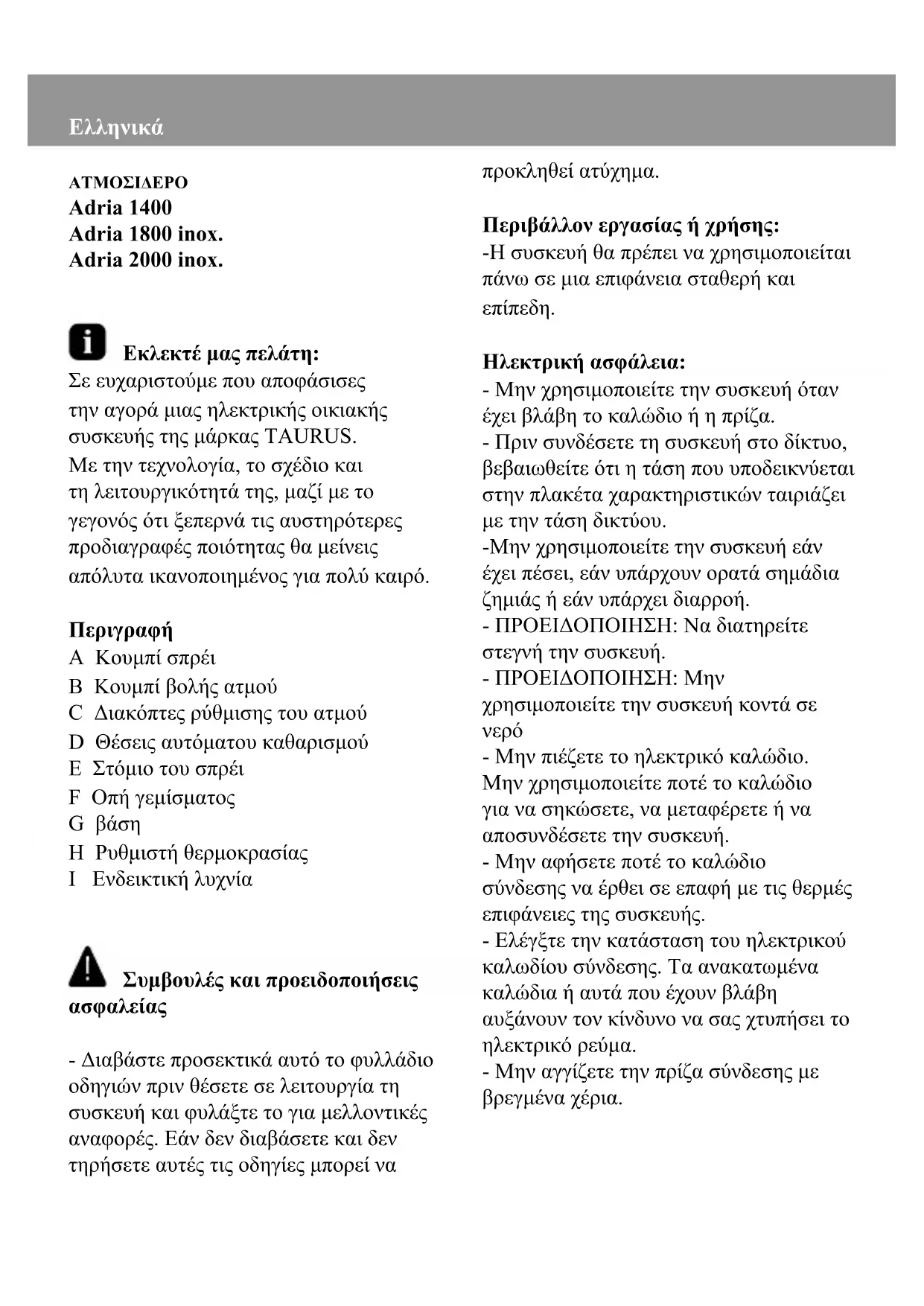 Adria 1400 Adria 1800 inox. Adria 2000 inox. Εκλεκτέ μας πελάτη: Σε ευχαριστούμε που αποφάσισες την αγορά μιας ηλεκτρικής οικιακής συσκευής της μάρκας TAURUS. Με την τεχνολογία, το σχέδιο και τη λειτουργικότητά της, μαζί με το γεγονός ότι ξεπερνά τις αυστηρότερες προδιαγραφές ποιότητας θα μείνεις απόλυτα ικανοποιημένος για πολύ καιρό.