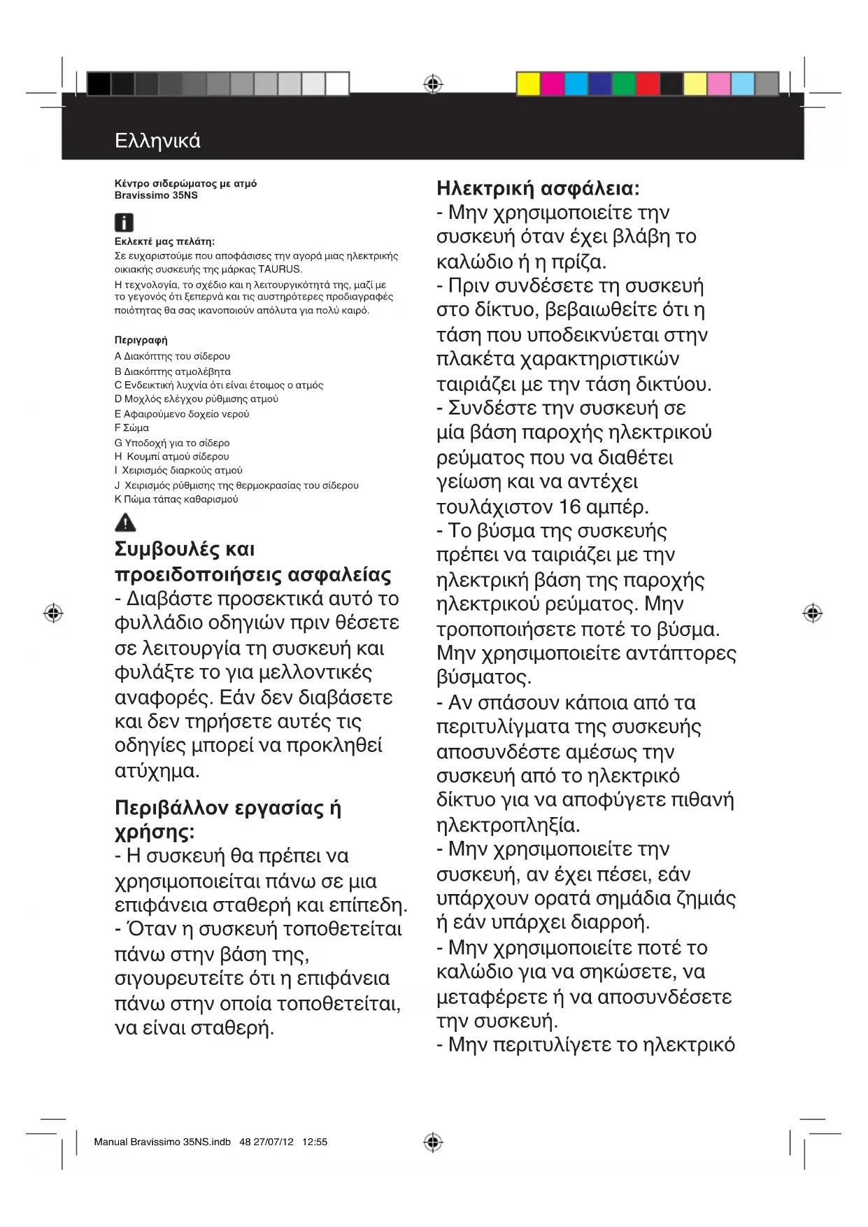 Υπήρχε εναπομένων ατμός από την τελευταία φορ που σιδερώσατε. Η συσκευή είναι κρύα (ήχοι που οφείλονται στην διαστολή του ατμολέβητα). Ο ατμολέβητας είναι δειος και χρειζεται να γεμιστεί με νερό. Πατήστε τον διακόπτη του ατμού (H) για να εξέλθει η πίεση. Αυτό το φαινόμενο είναι φυσιολογικό. Θα εξαφανιστεί σε λίγα λεπτ. Είναι φυσιολογικό και θα εξαφανιστεί με το γέμισμα του νερού. Για προϊόντα την Ευρωπαϊκής Ένωσης ή/και σε περίπτωση που κτι τέτοιο απαιτεί η νομοθεσία στην χώρα προέλευσής σας: Οικολογία και δυνατότητα ανακύκλωσης του προϊόντος - Τα υλικ που αποτελούν τη συσκευασία αυτής της ηλεκτρικής οικιακής συσκευής, εντσσονται σε ένα σύστημα συλλογής, διαλογής και ανακύκλωσής τους. - Το προϊόν είναι απαλλαγμένο από συγκεντρώσεις συστατικών που μπορεί να θεωρηθούν βλαβερ για το περιβλλον. Αυτό το σύμβολο σημαίνει πως εν επιθυμείτε να πετξετε το προϊόν μετ το πέρας ζωής του, θα πρέπει να το κνετε με τον ενδεδειγμένο τρόπο μέσω ενός φορέα διαχείρισης αποβλήτων, εξουσιοδοτημένο για την επιλεκτική συλλογή Αποβλήτων Ηλεκτρικών και Ηλεκτρονικών Συσκευών (ΑΗΗΣ). Η παρούσα συσκευή πληροί την Οδηγία 2006/95/ΕΟΚ Χαμηλής Τσης και την Οδηγία 2004/108/ΕΟΚ Ηλεκτρομαγνητικής Συμβατότητας. Manual Bravissimo 35NS.indb 52 27/07/12 12:55Русски Утюг с парогенератором Bravissimo 35NS Уважаемые покупатели! Благодарим вас за то, что вы остановили сво выбор на утюге с парогенератором марки TAURUS для домашнего использования. Применение передовых технологи, современны дизан, функциональность и соблюдение строгих требовани к качеству гарантируют продолжительную эксплуатацию прибора.