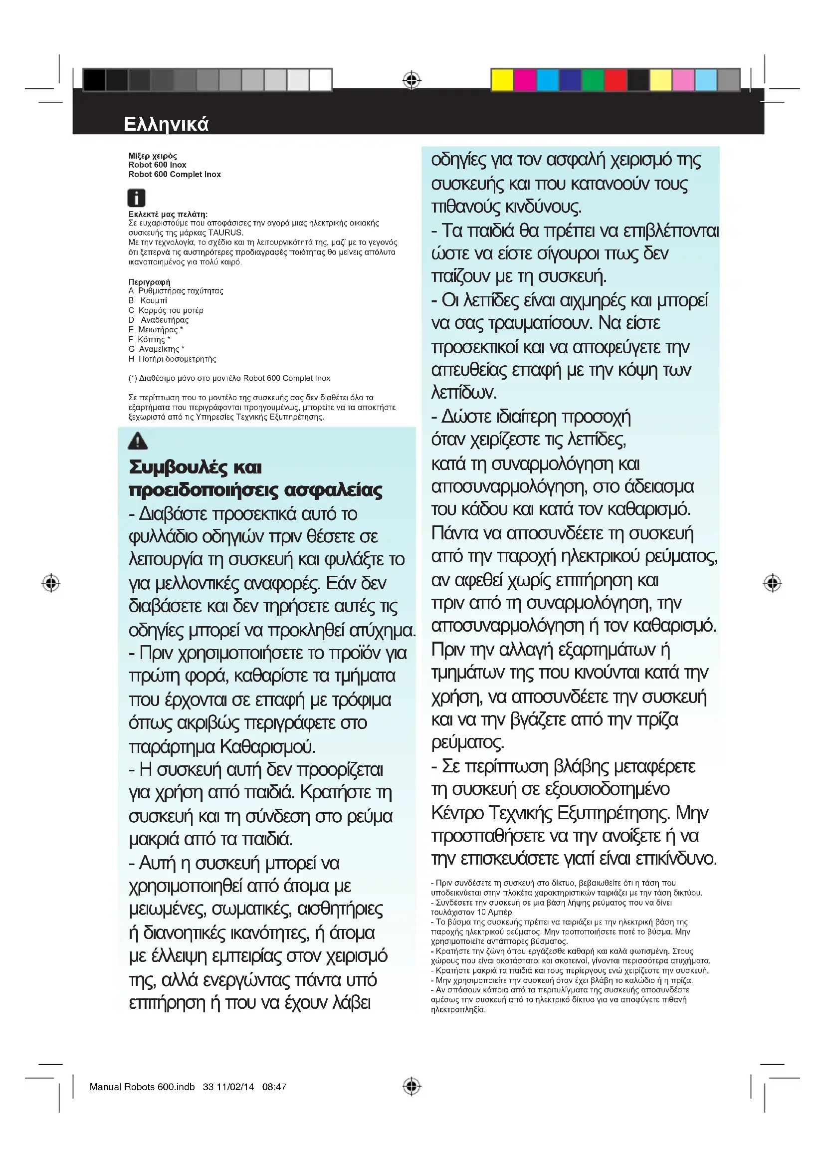 A Ρυθμιστήρας ταχύτητας B Κουμπί C Κορμός του μοτέρ D Αναδευτήρας E Μειωτήρας * F Κόπτης * G Αναμείκτης * H Ποτήρι δοσομετρητής (*) Διαθέσιμο μόνο στο μοντέλο Robot 600 Complet Inox Σε περίπτωση που το μοντέλο της συσκευής σας δεν διαθέτει όλα τα εξαρτήματα που περιγράφονται προηγουμένως, μπορείτε να τα αποκτήστε ξεχωριστά από τις Υπηρεσίες Τεχνικής Εξυπηρέτησης. Συμβουλές και προειδοποιήσεις ασφαλείας - Διαβάστε προσεκτικά αυτό το φυλλάδιο οδηγιών πριν θέσετε σε λειτουργία τη συσκευή και φυλάξτε το για μελλοντικές αναφορές. Εάν δεν διαβάσετε και δεν τηρήσετε αυτές τις οδηγίες μπορεί να προκληθεί ατύχημα. - Πριν χρησιμοποιήσετε το προϊόν για πρώτη φορά, καθαρίστε τα τμήματα που έρχονται σε επαφή με τρόφιμα όπως ακριβώς περιγράφετε στο παράρτημα Καθαρισμού. - Η συσκευή αυτή δεν προορίζεται για χρήση από παιδιά. Κρατήστε τη συσκευή και τη σύνδεση στο ρεύμα μακριά από τα παιδιά. - Αυτή η συσκευή μπορεί να χρησιμοποιηθεί από άτομα με μειωμένες, σωματικές, αισθητήριες ή διανοητικές ικανότητες, ή άτομα με έλλειψη εμπειρίας στον χειρισμό της, αλλά ενεργώντας πάντα υπό επιτήρηση ή που να έχουν λάβει οδηγίες για τον ασφαλή χειρισμό της συσκευής και που κατανοούν τους πιθανούς κινδύνους. - Τα παιδιά θα πρέπει να επιβλέπονται ώστε να είστε σίγουροι πως δεν παίζουν με τη συσκευή. - Οι λεπίδες είναι αιχμηρές και μπορεί να σας τραυματίσουν. Να είστε προσεκτικοί και να αποφεύγετε την απευθείας επαφή με την κόψη των