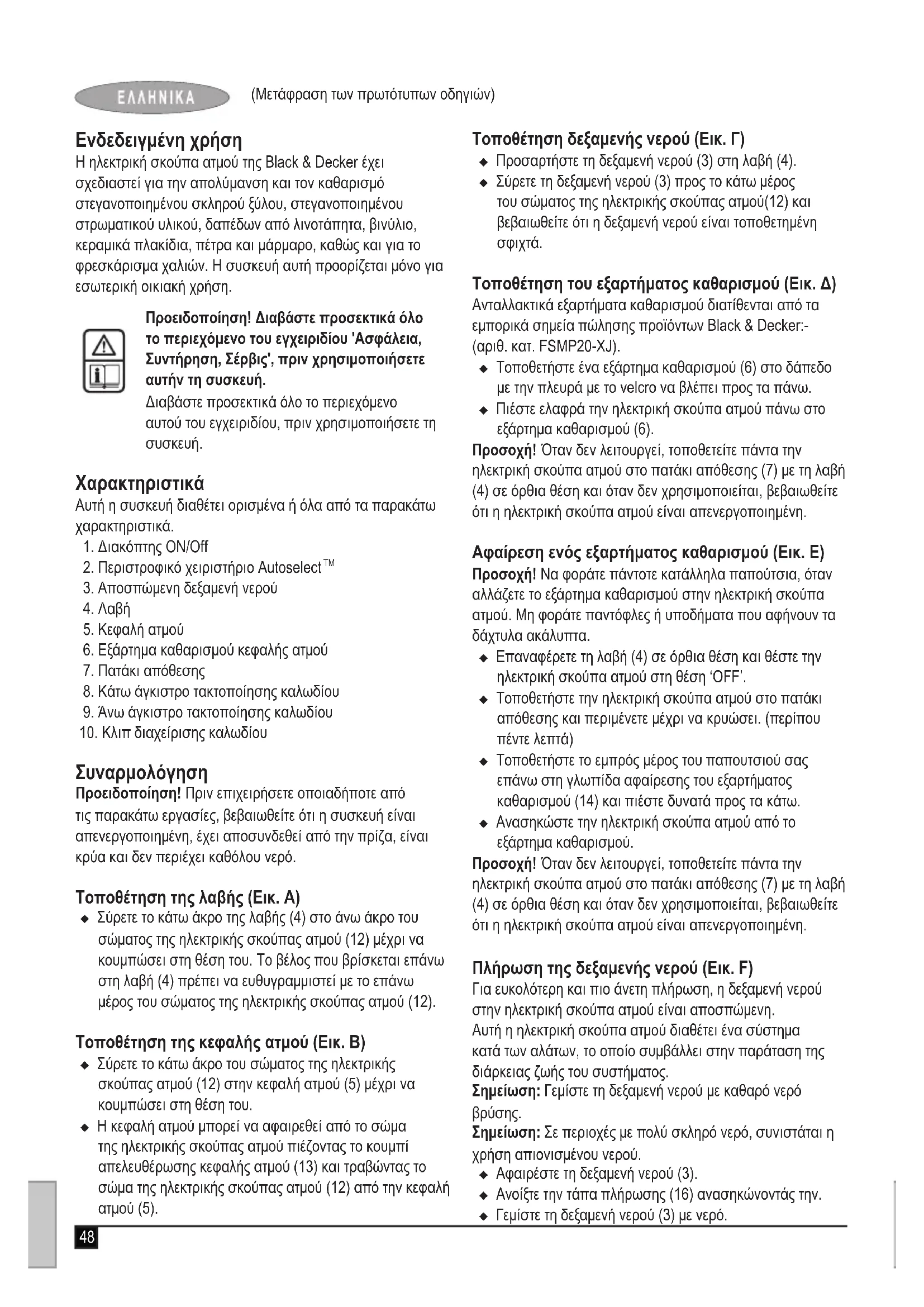 Katso kaikkien osien ja lisävarusteiden oikean asennuksen ohjeet kokoamista käsittelevästä oppaan luvusta. Mistä saan lisätietoja/ lisävarusteita höyrymoppiin. 13 www.blackanddecker./steammop48 (Μετάφραση των πρωτότυπων οδηγιών) Ενδεδειγμένη χρήση Η ηλεκτρική σκούπα ατμού της Black & Decker έχει σχεδιαστεί για την απολύμανση και τον καθαρισμό στεγανοποιημένου σκληρού ξύλου, στεγανοποιημένου στρωματικού υλικού, δαπέδων από λινοτάπητα, βινύλιο, κεραμικά πλακίδια, πέτρα και μάρμαρο, καθώς και για το φρεσκάρισμα χαλιών. Η συσκευή αυτή προορίζεται μόνο για εσωτερική οικιακή χρήση. Προειδοποίηση! Διαβάστε προσεκτικά όλο το περιεχόμενο του εγχειριδίου 'Ασφάλεια, Συντήρηση, Σέρβις', πριν χρησιμοποιήσετε αυτήν τη συσκευή. Διαβάστε προσεκτικά όλο το περιεχόμενο αυτού του εγχειριδίου, πριν χρησιμοποιήσετε τη