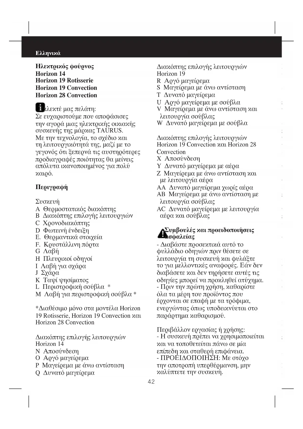 Ηλεκτρικόςφούρνος Horizon 14 Horizon 19 Rotisserie Horizon 19 Convection Horizon 28 Convection Εκλεκτέ μας πελάτη: Σε ευχαριστούμε που αποφάσισες την αγορά μιας ηλεκτρικής οικιακής συσκευής της μάρκας TAURUS. Με την τεχνολογία, το σχέδιο και τη λειτουργικότητά της, μαζί με το γεγονός ότι ξεπερνά τις αυστηρότερες προδιαγραφές ποιότητας θα μείνεις απόλυτα ικανοποιημένος για πολύ
