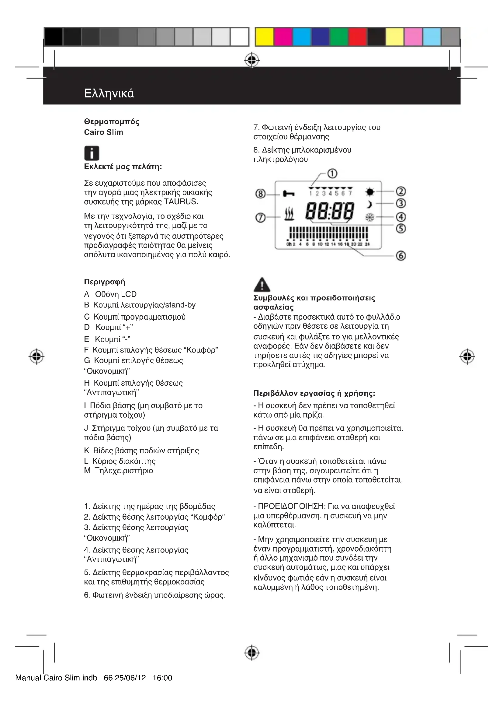 - Τα παιδι δεν πρέπει να κνουν Manual Cairo Slim.indb 67 25/06/12 16:00εργασίες καθαρισμού ή συντήρησης στην συσκευή, εκτός κι αν επιβλέπονται από έναν ενήλικα. - Αυτή η συσκευή δεν είναι ένα παιχνίδι. Τα παιδι θα πρέπει να επιβλέπονται ώστε να είστε σίγουροι πως δεν παίζουν με τη συσκευή. - Κρατήστε αυτήν την συσκευή μακρι από τα παιδι και/ή από τομα με ειδικές