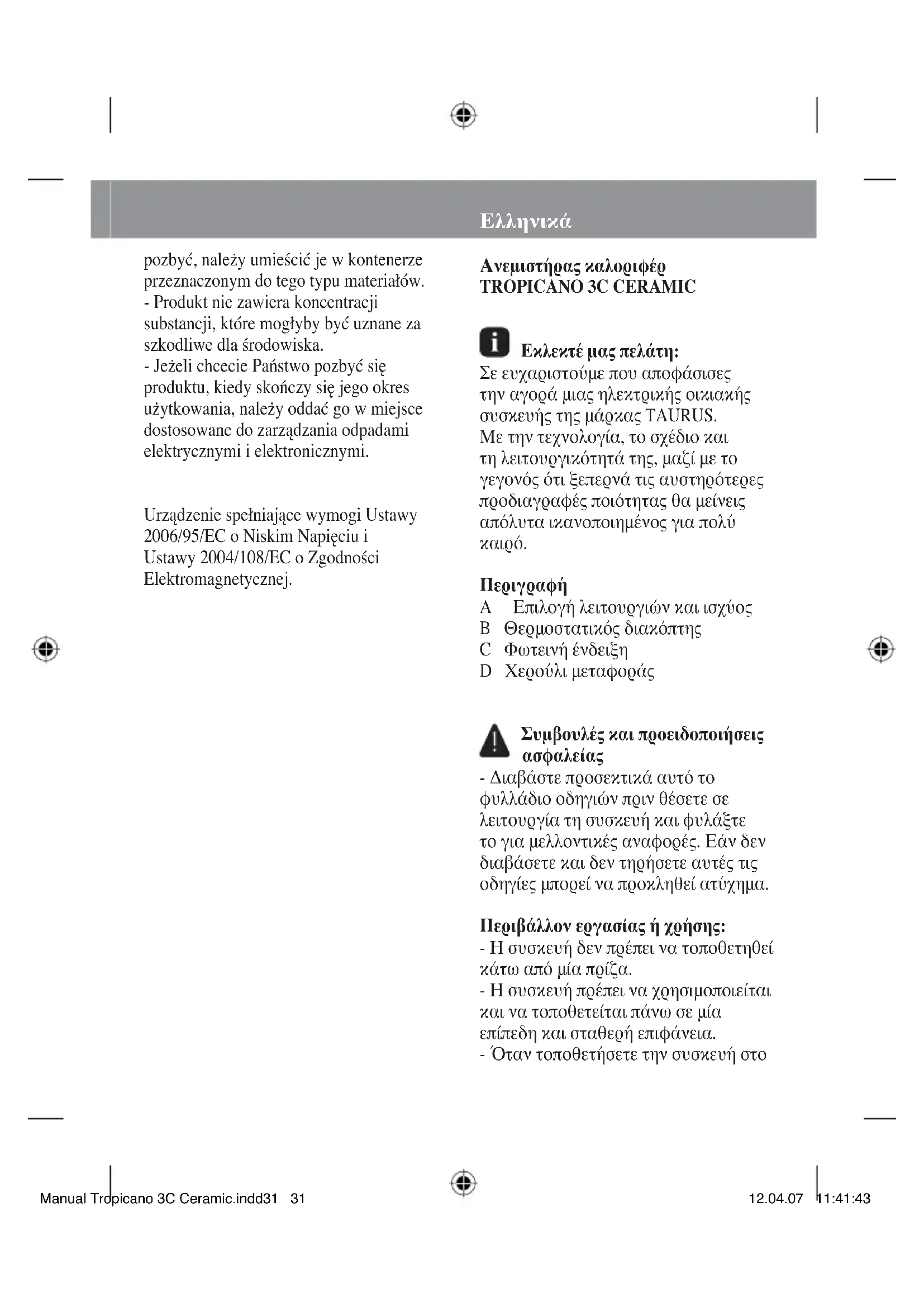 - Μη χρησιμοποιείτε διαλυτικά ή προϊόντα με όξινο ή βασικό ph όπως η αλισίβα ή προϊόντα λείανσης για τον καθαρισμό της συσκευής. - Μη βυθίζετε τη συσκευή σε νερό ή άλλο υγρό, και μην την τοποθετείτε κάτω από τη βρύση. Δυσλειτουργίες και επισκευή - Σε περίπτωση βλάβης μεταφέρετε τη συσκευή σε εξουσιοδοτημένο Κέντρο Τεχνικής Εξυπηρέτησης. Μην προσπαθήσετε να την ανοίξετε ή να την επισκευάσετε γιατί είναι επικίνδυνο. - Αν υπάρχει πρόβλημα με την σύνδεση του ηλεκτρικού κυκλώματος θα πρέπει να την αντικαταστήσετε και να συνεχίσετε όπως σε περίπτωση βλάβης. Οικολογία και δυνατότητα ανακύκλωσης του προϊόντος - Τα υλικά που αποτελούν τη συσκευασία αυτής της ηλεκτρικής οικιακής συσκευής, εντάσσονται σε ένα σύστημα συλλογής, διαλογής και ανακύκλωσής τους. Εάν επιθυμείτε να τα πετάξετε, μπορείτε να χρησιμοποιήσετε τους κατάλληλους για κάθε είδος υλικού δημόσιους κάδους. - Το προϊόν είναι απαλλαγμένο από συγκεντρώσεις συστατικών που μπορεί να θεωρηθούν βλαβερά για το περιβάλλον. - Εάν θελήσετε να πετάξετε το προϊόν, μετά το πέρας ζωής του, θα πρέπει να το κάνετε με τον ενδεδειγμένο τρόπο, μέσω ενός φορέα διαχείρισης αποβλήτων, εξουσιοδοτημένο για την επιλεκτική συλλογή αποβλήτων Η παρούσα συσκευή πληροί την Οδηγία 2006/95/ΕΟΚ Χαμηλής Τάσης και την Οδηγία 2004/108/ΕΟΚ Ηλεκτρομαγνητικής Συμβατότητας. Manual Tropicano 3C Ceramic.indd34 34Manual Tropicano 3C Ceramic.indd34 34 12.04.07 11:41:4512.04.07 11:41:45Русский ТЕРМОВЕНТИЛЯТОР Модель Tropicano 3C CERAMIC Уважаемый покупатель, Благодарим Вас за то, что Вы остановили свой выбор на термовентиляторе марки TAURUS. Использование передовых технологий, современный дизайн, функциональность, а также соблюдение строгих требований к качеству гарантирует Вам продолжительную эксплуатацию прибора.