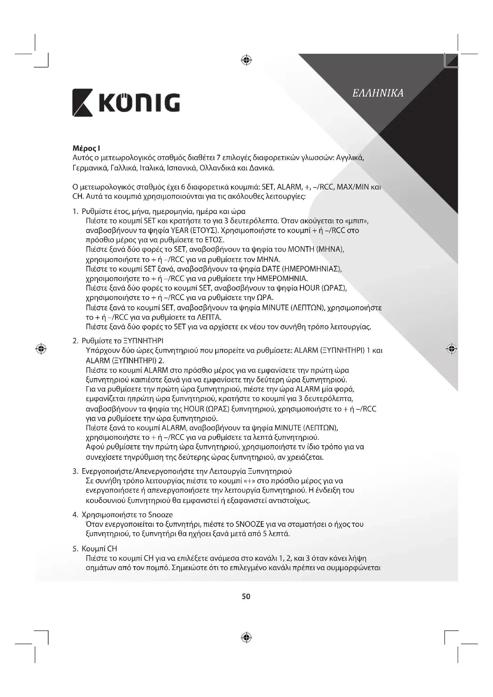 Μέρος I Αυτός ο μετεωρολογικός σταθμός διαθέτει 7 επιλογές διαφορετικών γλωσσών: Αγγλικά, Γερμανικά, Γαλλικά, Ιταλικά, Ισπανικά, Ολλανδικά και Δανικά. Ο μετεωρολογικός σταθμός έχει 6 διαφορετικά κουμπιά: SET, ALARM, +, –/RCC, MAX/MIN και CH. Αυτά τα κουμπιά χρησιμοποιούνται για τις ακόλουθες λειτουργίες: