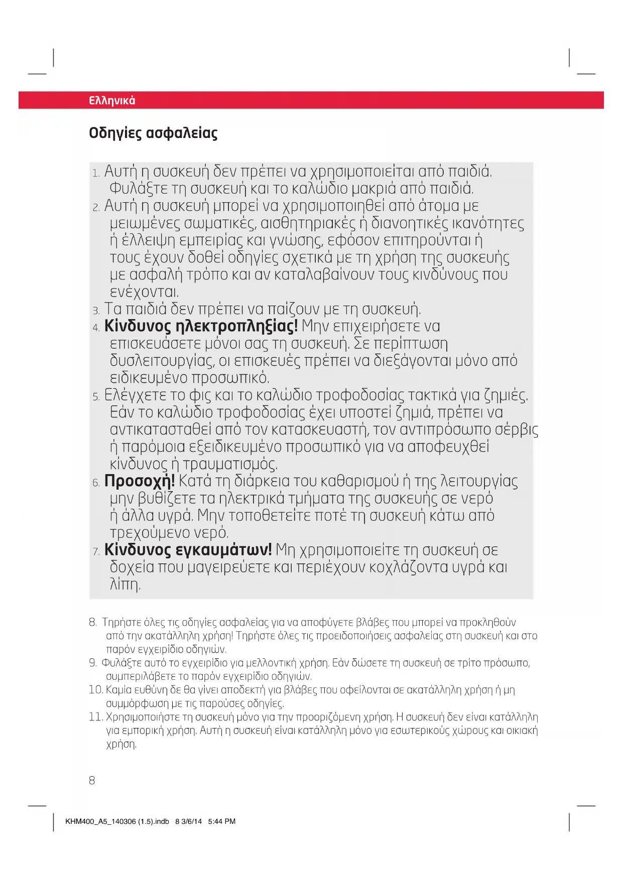 Ο διαγραμμένος κάδος απορριμάτων σημαίνει ότι απαιτείται η χωριστή συλλογή των αποβλήτων ηλεκτρικού και ηλεκτρονικού εξοπλισμού (οδηγία WEEE). Ο ηλεκτρικός και ο ηλεκτρονικός εξοπλισμός μπορεί να περιέχει επικίνδυνες ουσίες. Μην απορρίπτετε τη συσκευή μαζί με τα οικιακά απορρίμματα. Επιστρέψτε το σε ένα καθορισμένο σημείο συλλογής για ανακύκλωση σύμφωνα με την οδηγία περί Απόρριψης ηλεκτρικού και ηλεκτρονικού εξοπλισμού. Με αυτόν τον τρόπο, βοηθάτε στην διατήρηση των πόρων και την προστασία του περιβάλλοντος. Επικοινωνήστε με τον προμηθευτή σας ή τις τοπικές αρχές για περισσότερες πληροφορίες. KHM400_A5_140306 (1.5).indb 12 3/6/14 5:44 PM13 English Safety instructions